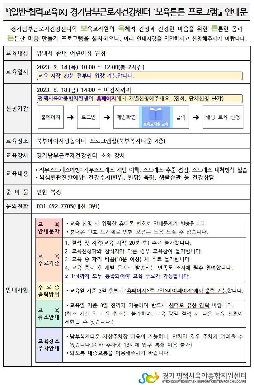교육명 [일반-협력교육Ⅸ] 경기남부근로자건강센터 ‘보육튼튼 프로그램’-정원 미달로 폐강 교육형태 오프라인 소규모