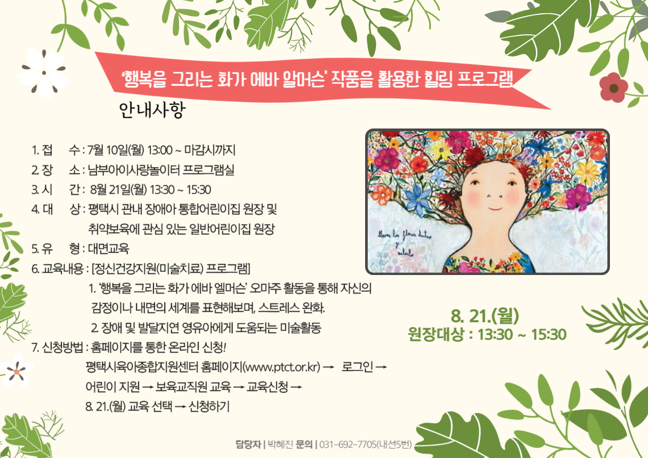 교육명 [취약보육] 행복을 그리는 '에바 알머슨' 오마주 힐링프로그램(원장대상) 교육형태 오프라인 소규모