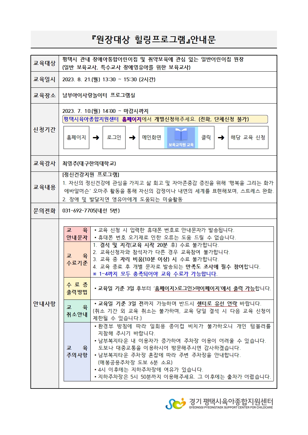 첨부파일 파일 [교육안내문] 장애아통합어린이집 원장 힐링프로그램(일반포함)001.jpg