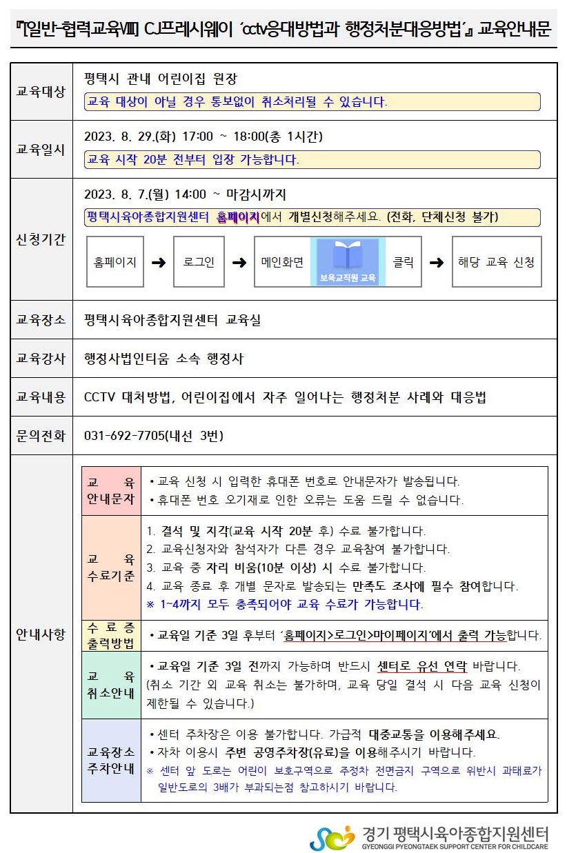 교육명 [일반-협력교육Ⅷ] CJ프레시웨이 ‘cctv응대방법과 행정처분대응방법’ 교육형태 오프라인 소규모