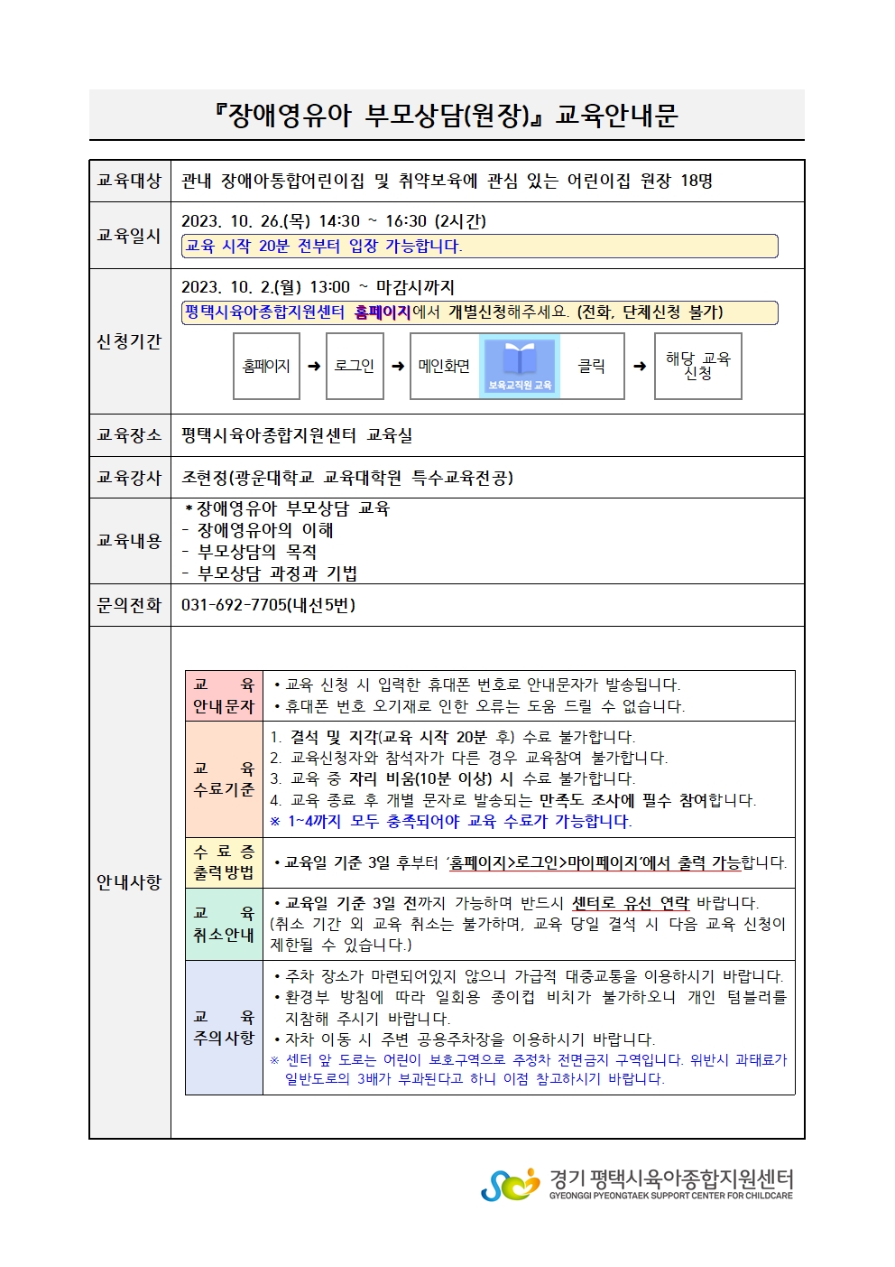 첨부파일 파일 [교육안내문(대면)] 장애영유아 부모상담교육(원장)001.jpg