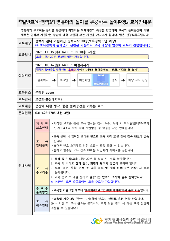 교육명 [일반-경력역량강화] 영유아의 놀이를 존중하는 놀이환경 교육형태 온라인 zoom