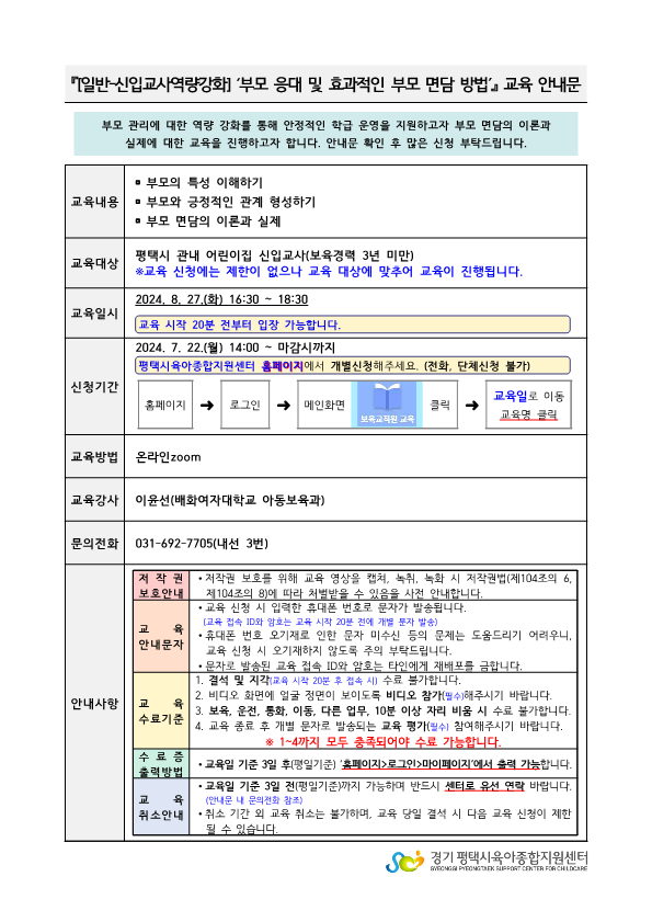교육명 [일반-신입교사역량강화] 부모 응대 및 효과적인 부모 면담 방법 교육형태 온라인 zoom