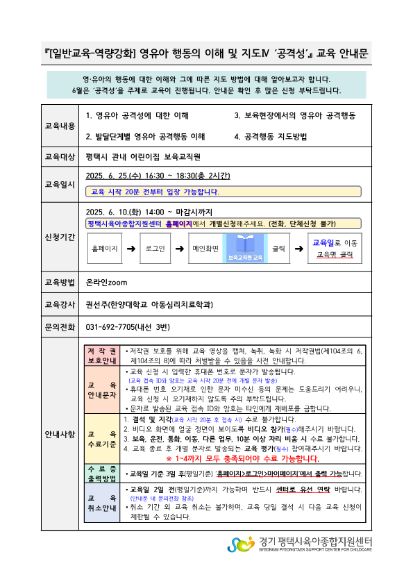 교육명 [일반교육-역량강화] 영유아 행동의 이해 및 지도Ⅳ '공격성' 교육형태 온라인 zoom