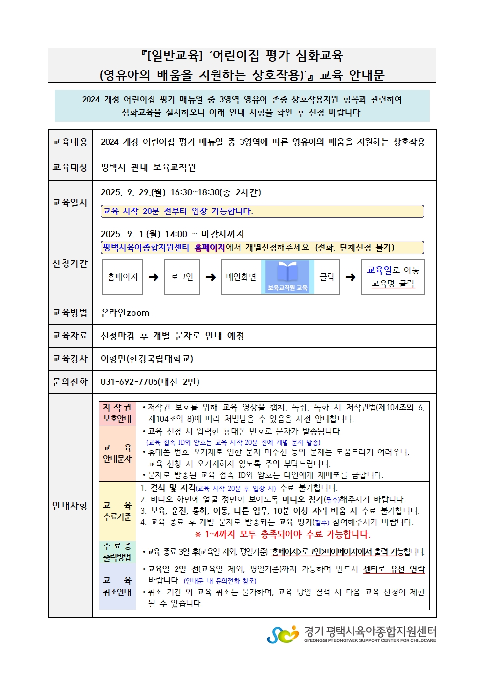 교육대상 평택시 관내 보육교직원 강사명 이형민(한경국립대학교)