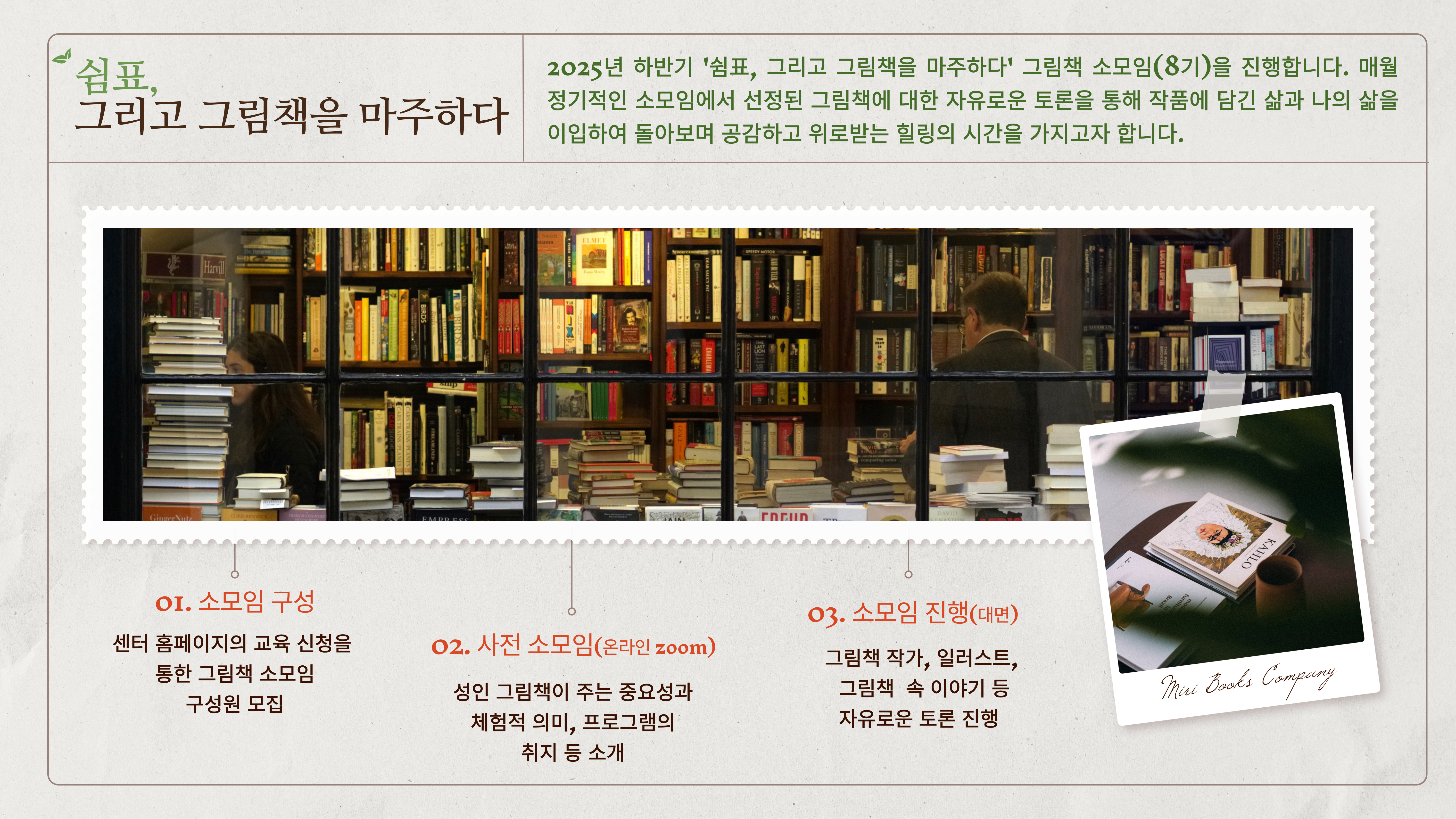 교육명 [특색사업] 쉼표, 그리고 그림책을 마주하다(8기) 교육형태 오프라인 소규모