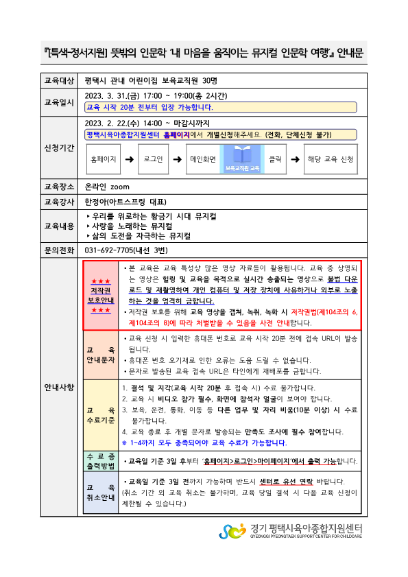 교육대상 평택시 관내 어린이집 보육교직원 강사명 한정아(아트스프링)