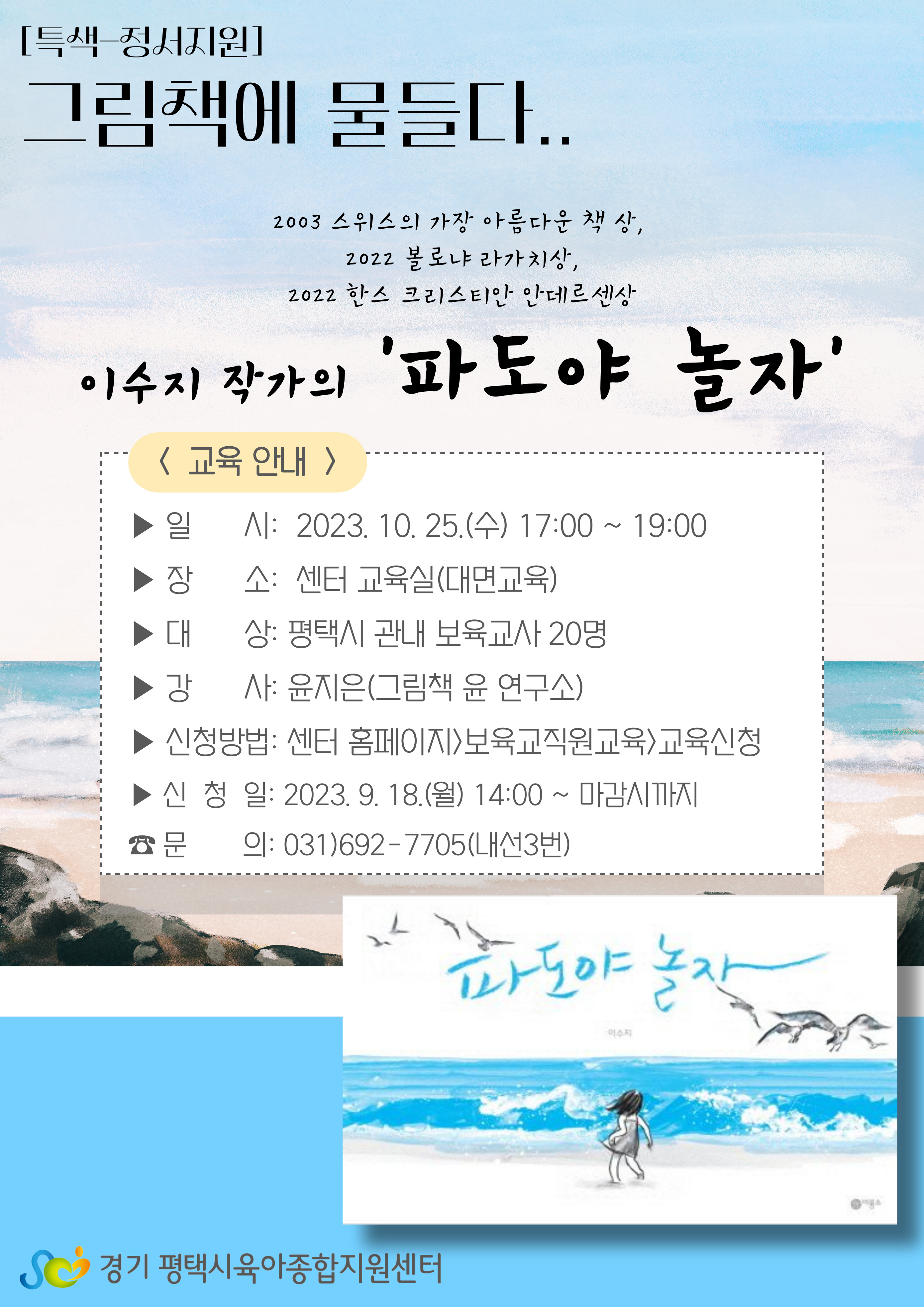 교육명 [특색-정서지원] 그림책에 물들다Ⅵ '파도야 놀자' 이수지 작가편 교육형태 오프라인 소규모