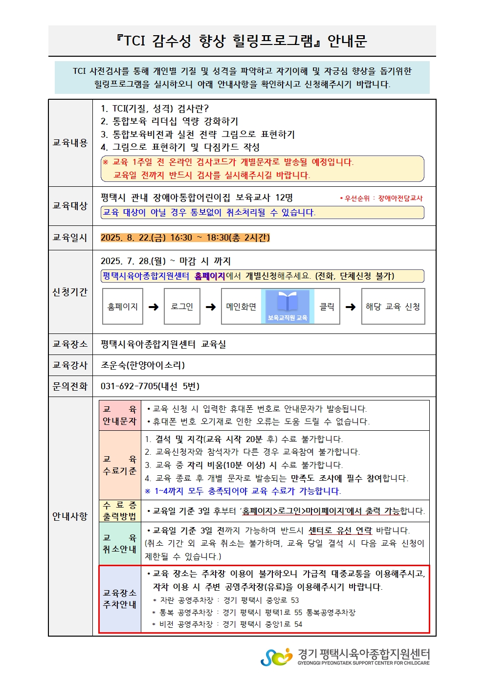 교육명 [장애영유아보육교사전문성강화] TCI 감수성 향상 힐링프로그램 -★평택시 관내 보육교사★ 교육형태 오프라인 소규모