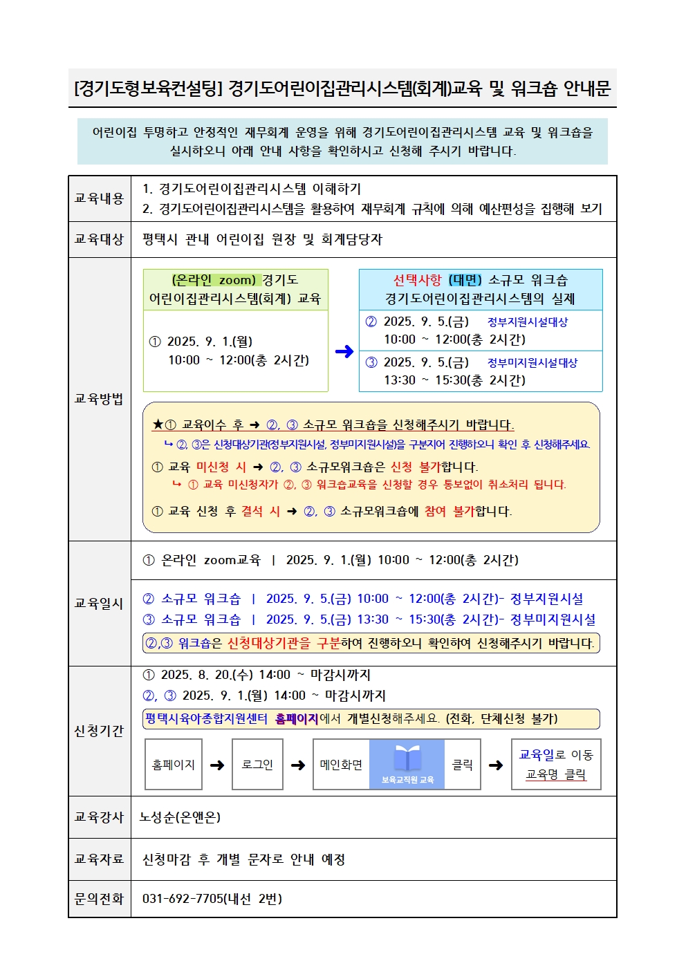 교육명 [경기도형보육컨설팅] 워크숍-경기도어린이집관리시스템 실제(정부미지원시설대상) 교육형태 오프라인 소규모
