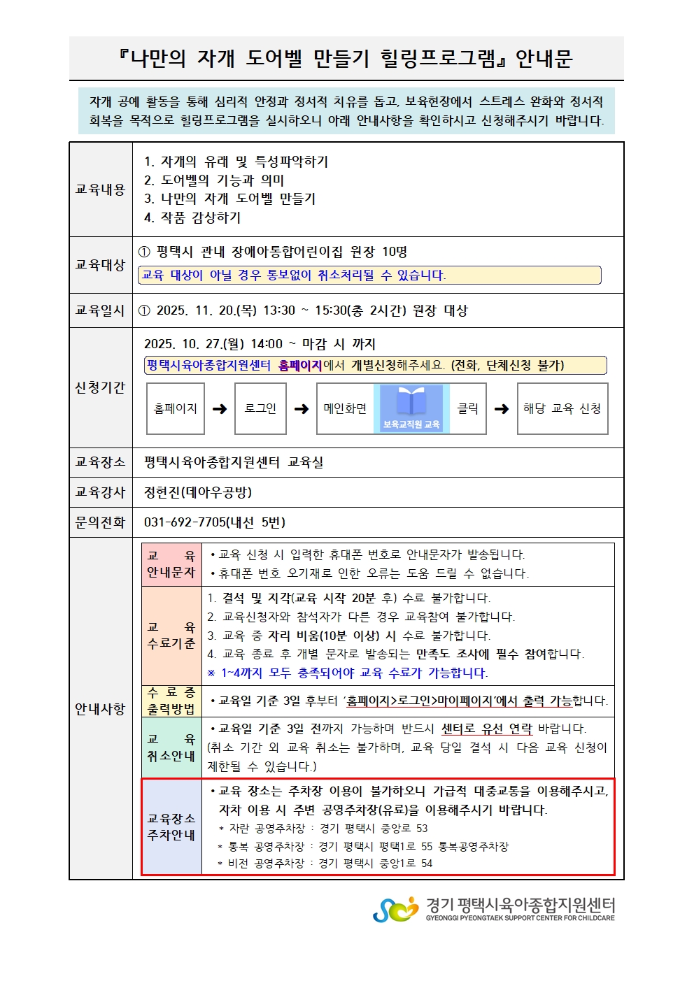 교육장소 평택시육아종합지원센터 교육실 교육비 무료