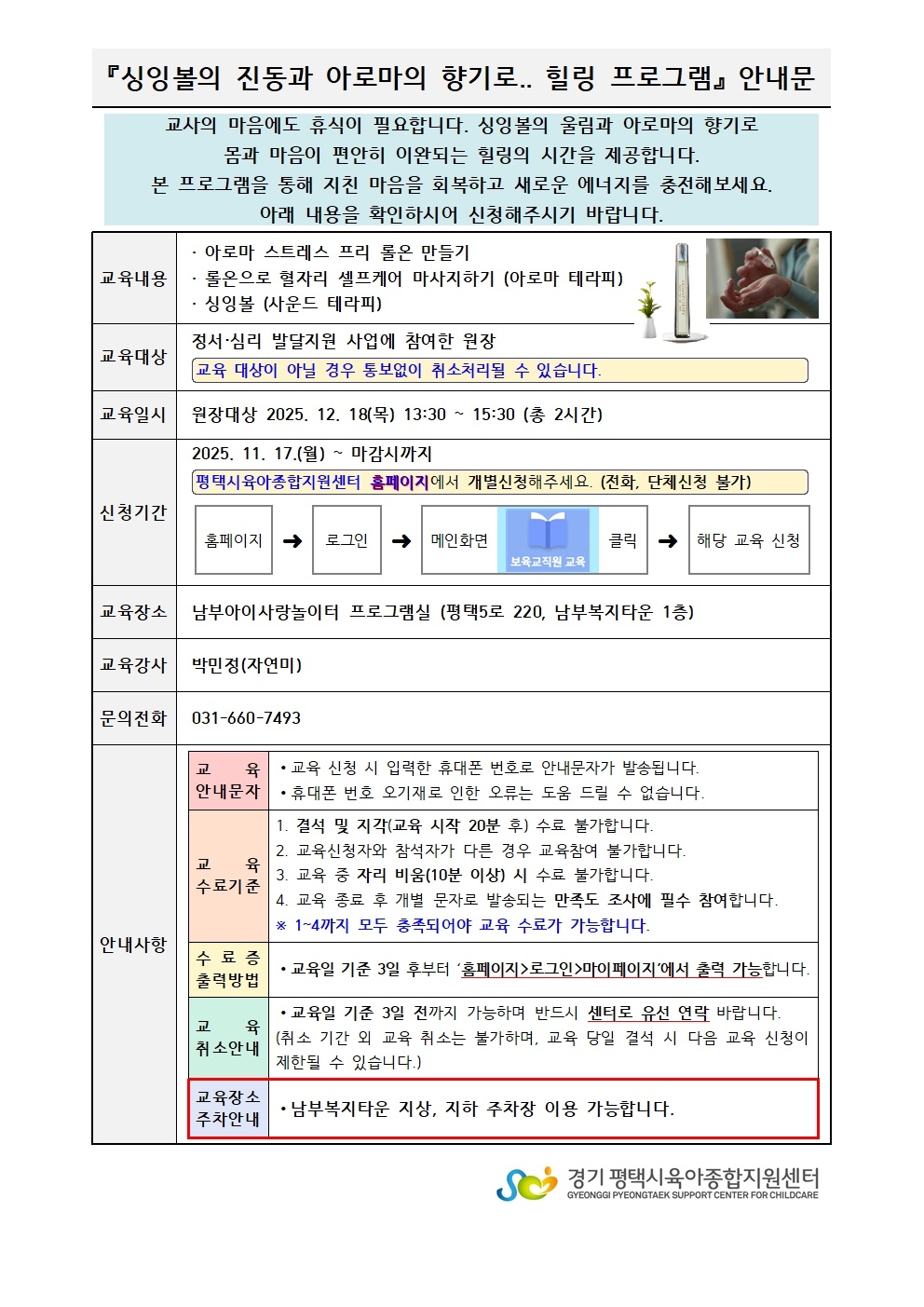 교육명 [정서·심리] (원장대상) 싱잉볼의 진동과 아로마의 향기로 힐링프로그램 교육형태 오프라인 소규모