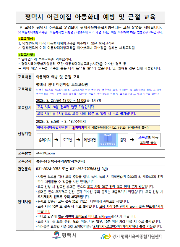 교육명 2026년 평택시 어린이집 아동학대 예방 및 근절 교육 교육형태 온라인 zoom