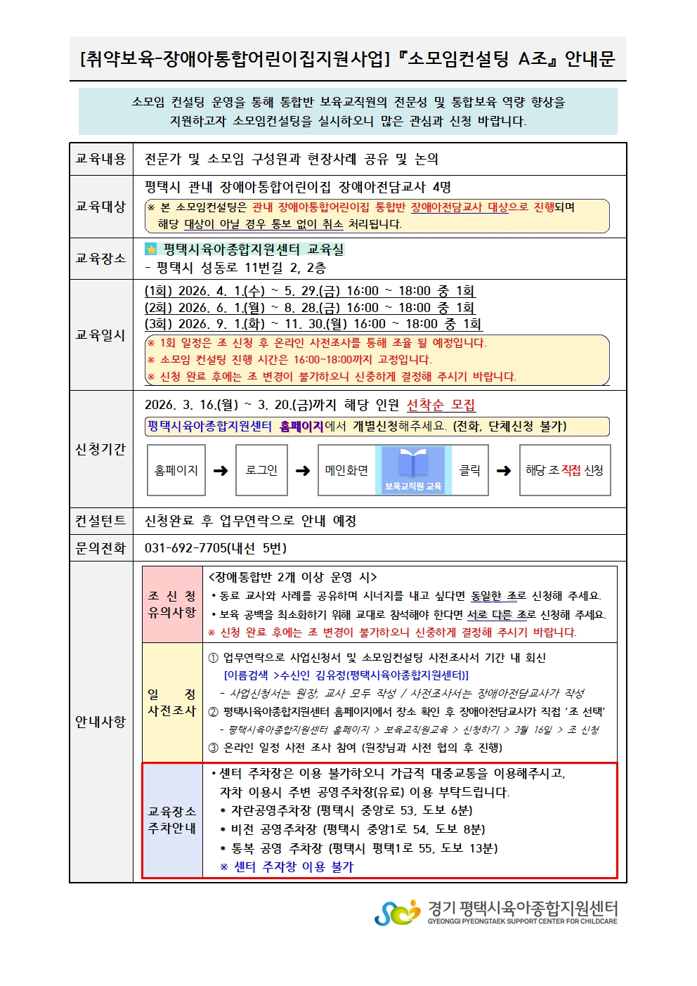 기타사항 ※ 본 소모임컨설팅은 관내 장애아통합어린이집 통합반 장애아전담교사 대상으로 진행되며
