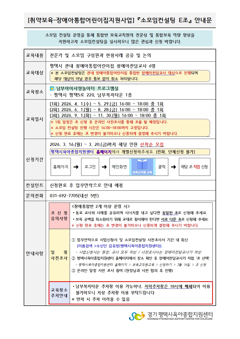 교육명 [취약보육-장애아통합어린이집지원사업] 『소모임컨설팅 E조』 - 남부 교육형태 오프라인 소규모