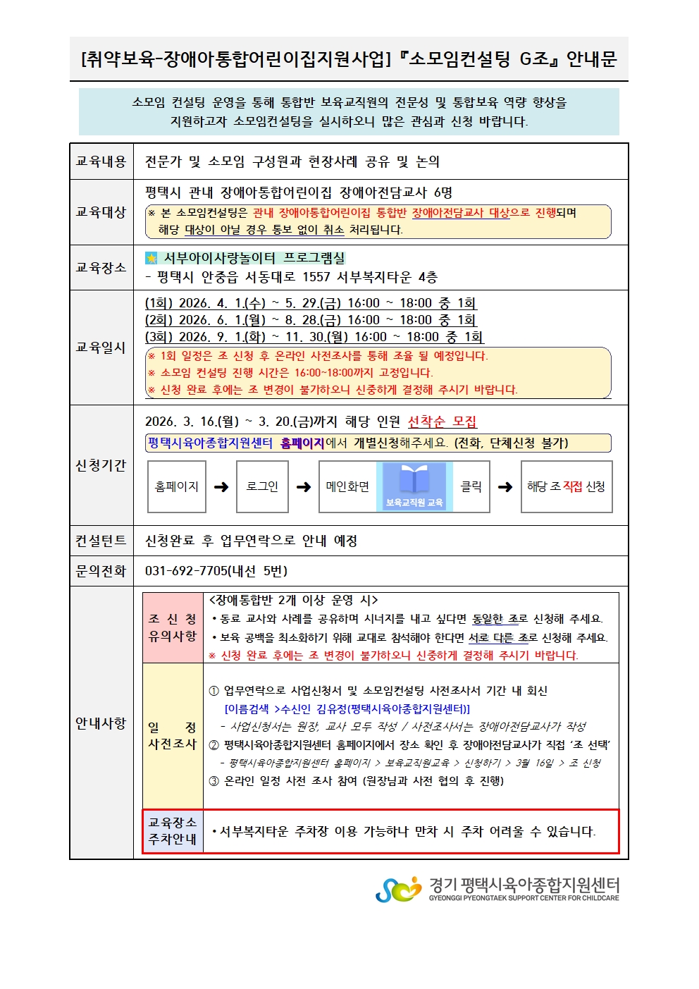 교육명 [취약보육-장애아통합어린이집지원사업] 『소모임컨설팅 G조』 - 서부 교육형태 오프라인 소규모