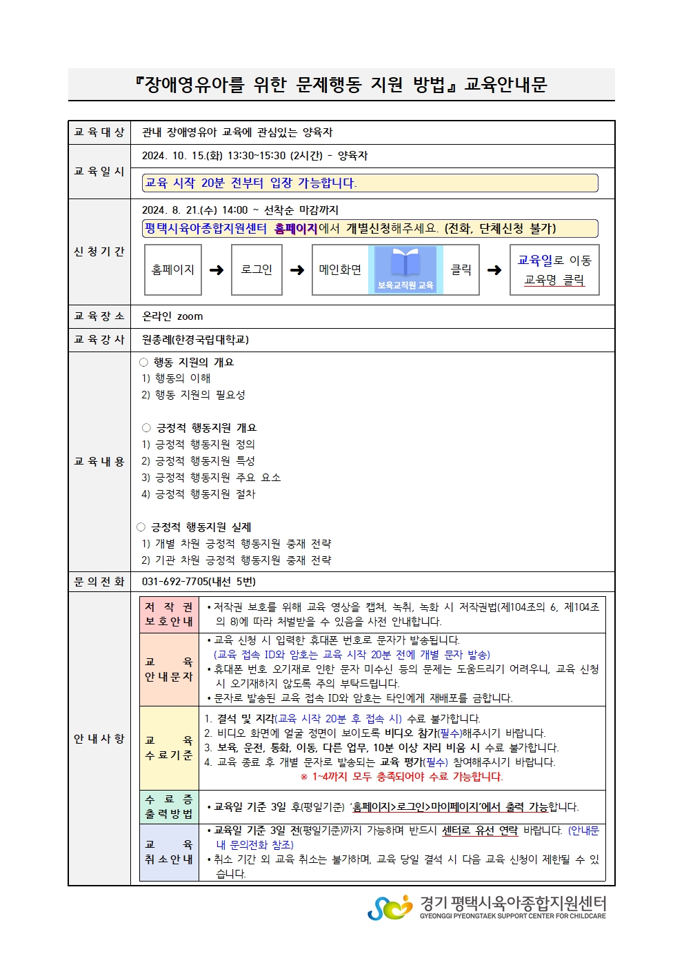 교육명 [장애 전문성 강화] 장애영유아를 위한 문제행동 지도방법 - ★양육자 대상(폐강)★ 교육형태 온라인 zoom