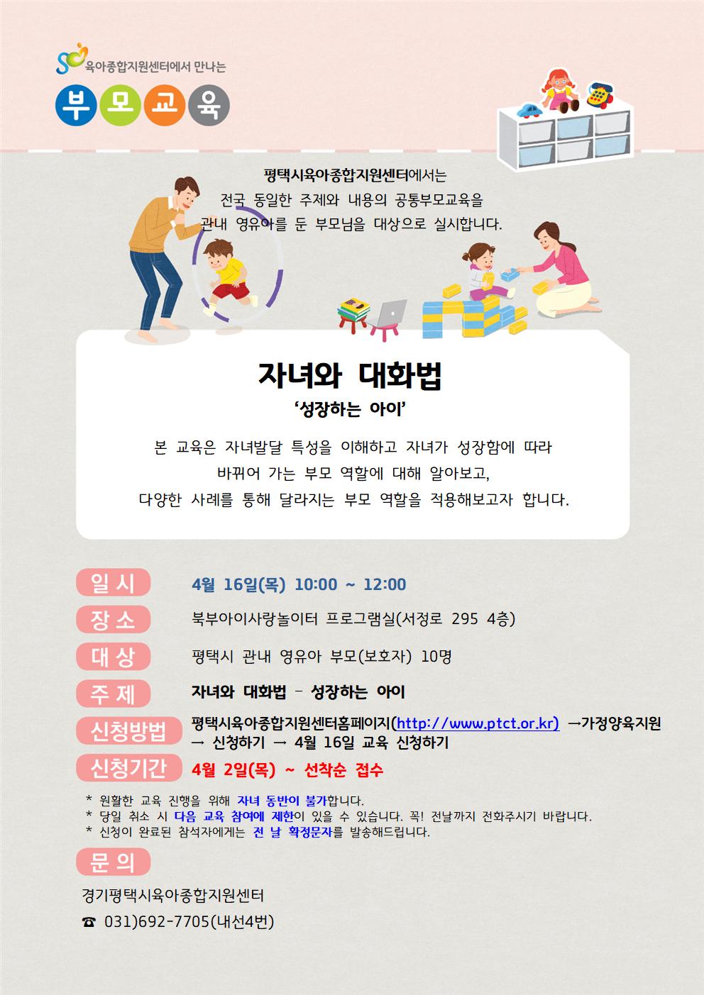 | 교육대상 | 부모 | 교육장소 | 북부아이사랑놀이터 프로그램실 |