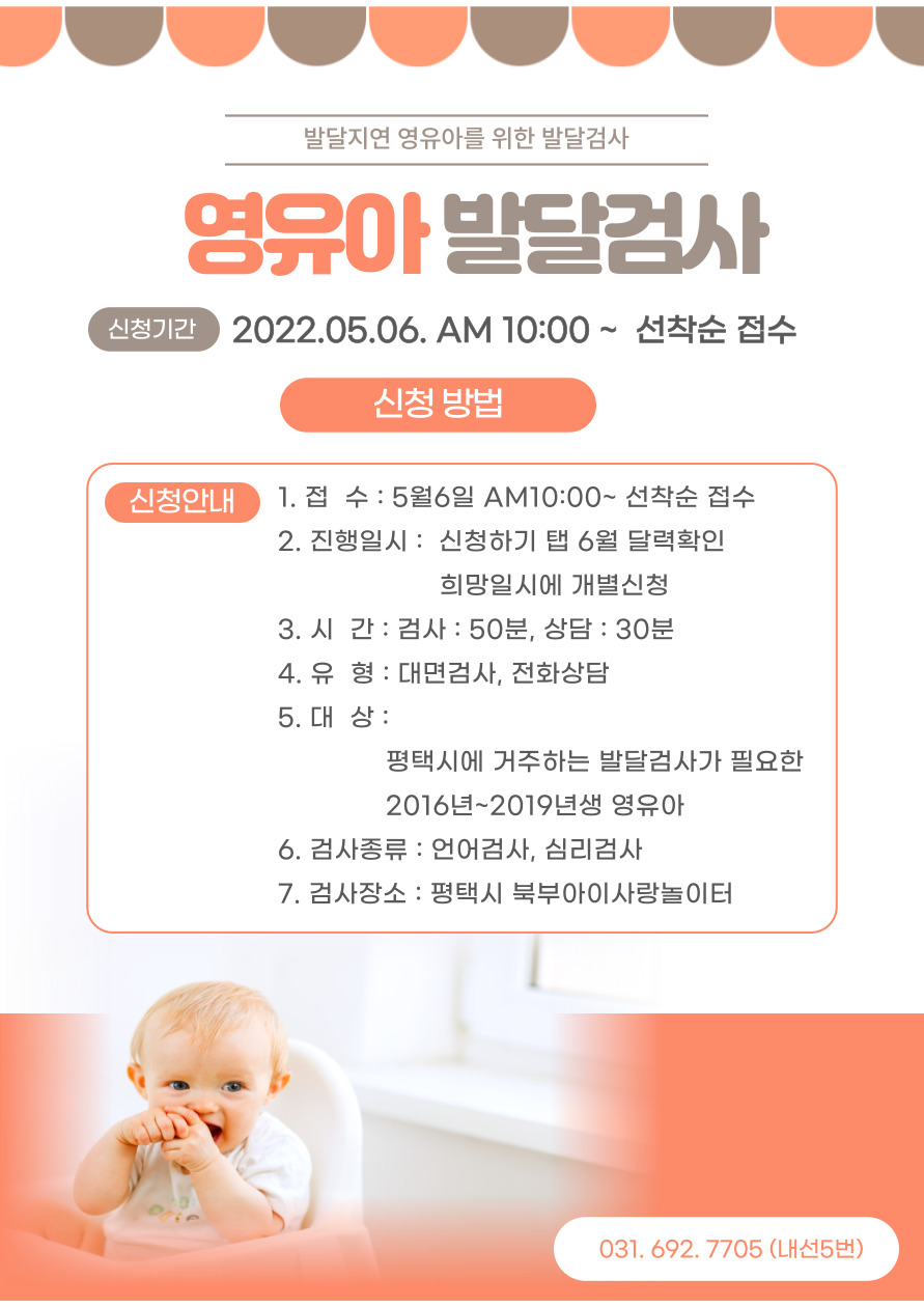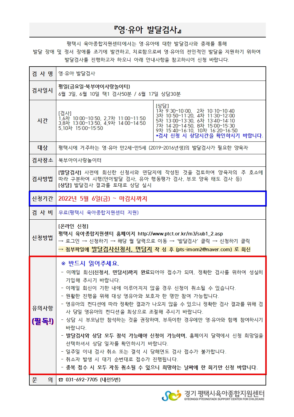 검사일시 - 6월10일 14:00~14:50 (영유아 동반 대면검사) 상담일시 - 6월 17일 15:40~16:10 (비대면 전화상담)