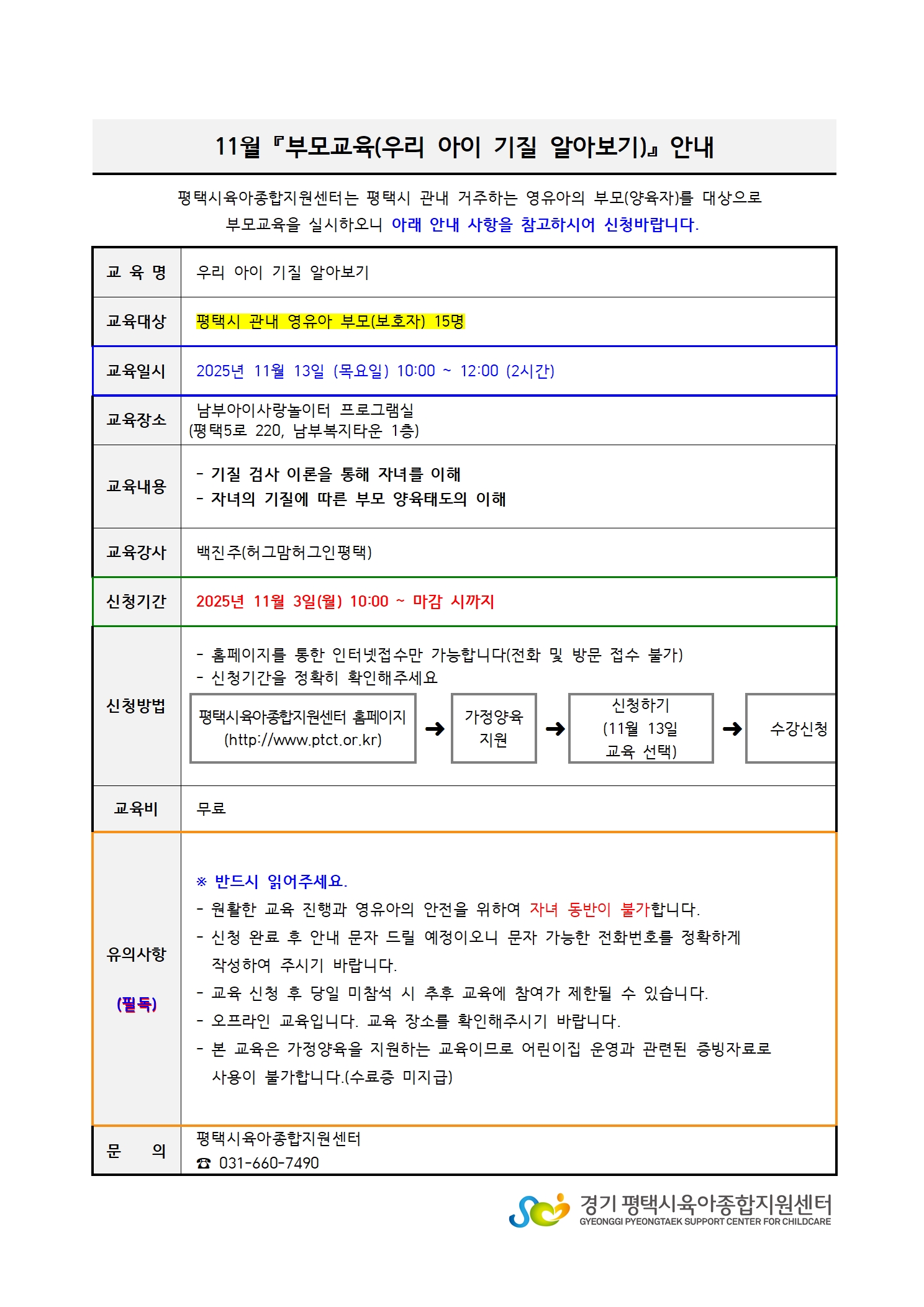| 교육명 | 우리 아이 기질 알아보기 | 교육형태 | 오프라인 소규모 |