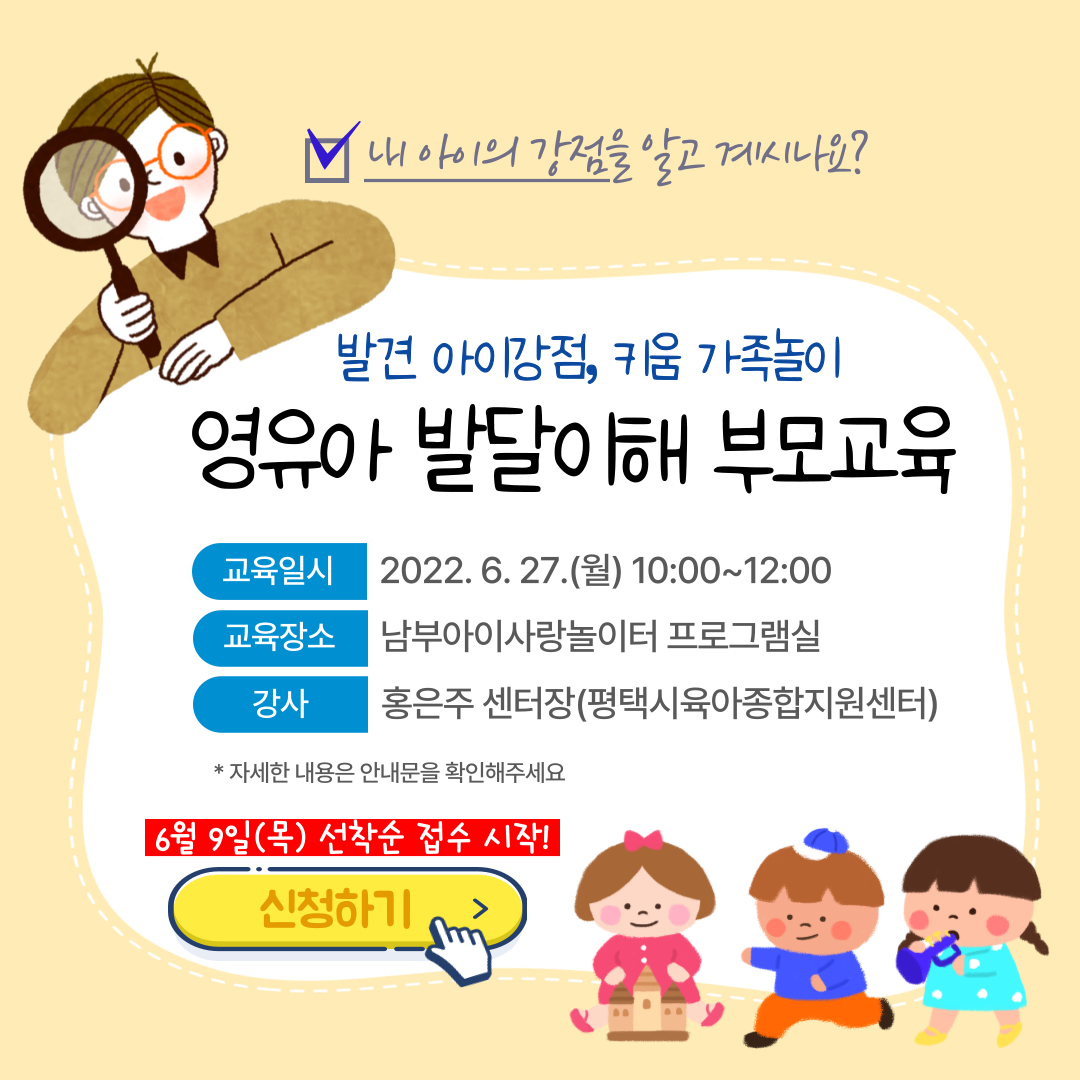 ※ 교육은 방역지침을 준수하며 진행됩니다. 손소독 및 마스크착용 부탁드립니다. ※ 원활한 교육 진행과 영유아의 안전을 위하여 부모님(보호자)만 참석 가능합니다(영유아 참석 불가). ※ 신청 취소 시 다음 교육 및 프로그램 참여에 제한이 있을 수 있습니다. ※ 평택시 관내 영유아 가정양육을 지원하는 교육으로, 수료증 발급은 되지 않습니다.