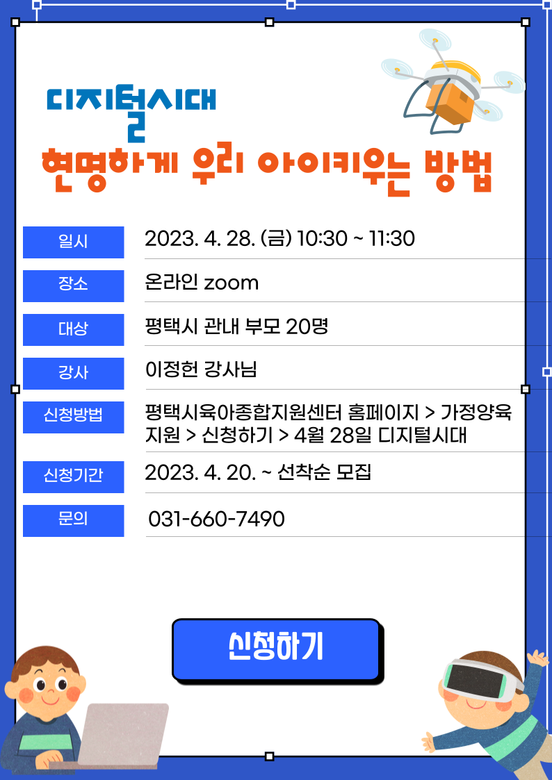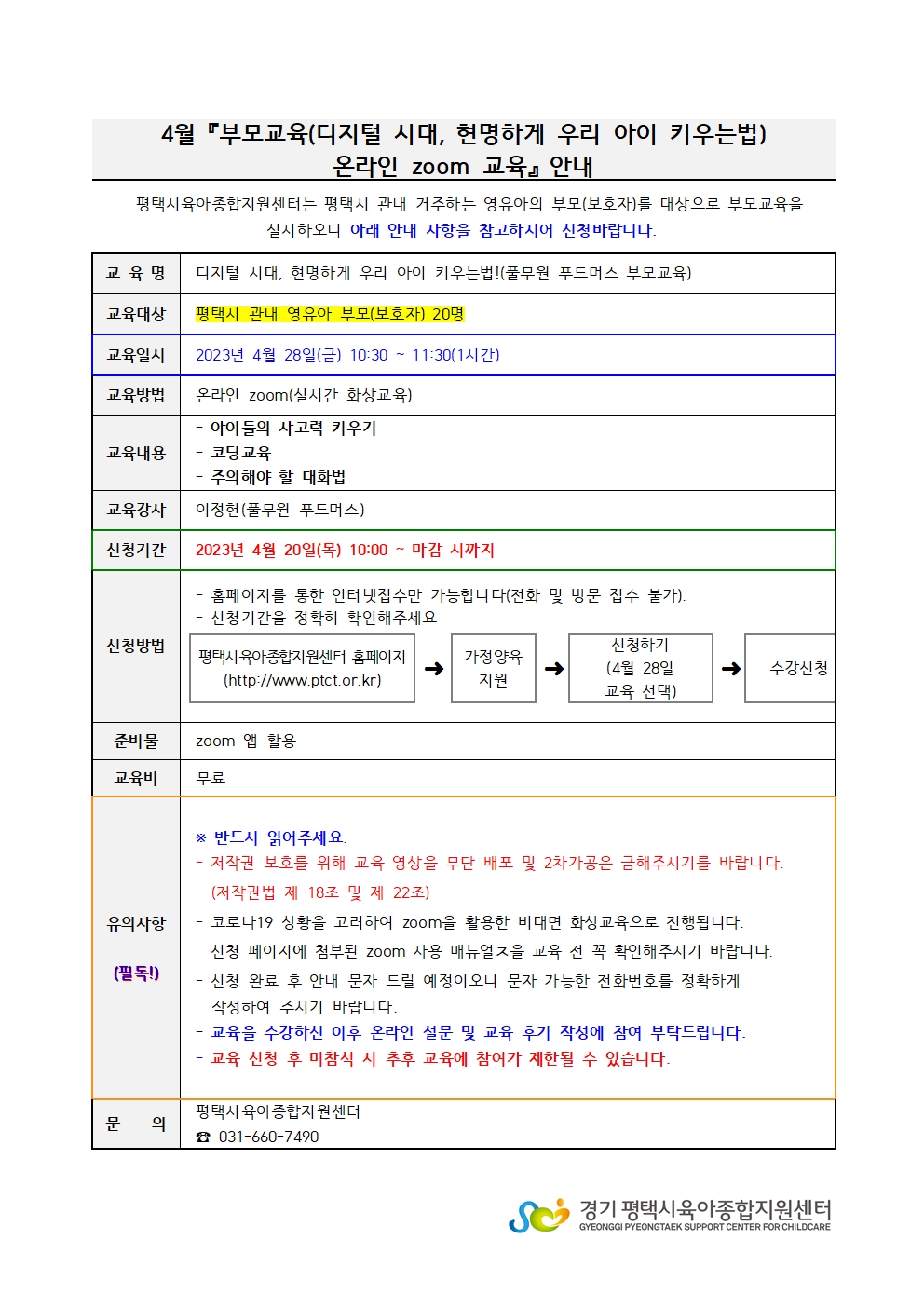 * * 반드시 읽어주세요 * * ※ 평택시 관내 영유아 가정양육을 지원하는 교육으로, 수료증 발급은 되지 않습니다. ※ 신청 취소 시 다음 교육 및 프로그램 참여에 제한이 있을 수 있습니다. ※ 온라인 zoom으로 진행되는 수업입니다. 카메라는 ON으로 얼굴이 나와야하며, 교육의 지장이 있는 행동 시 ZOOM에서 내보내기 될 수 있습니다. (예: 카메라 OFF, 운전) ☎문의: 자자체부모교육 담당자(031-660-7490)   | |||