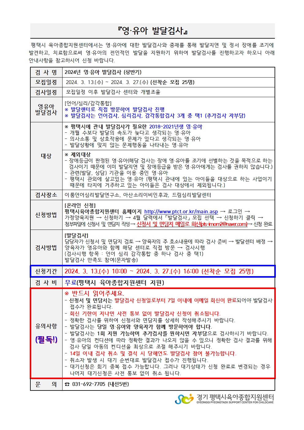 | 첨부파일 |  발달검사 면담지 및 신청서(2024).docx  2024년 영유아 발달검사 안내문.hwp | ||