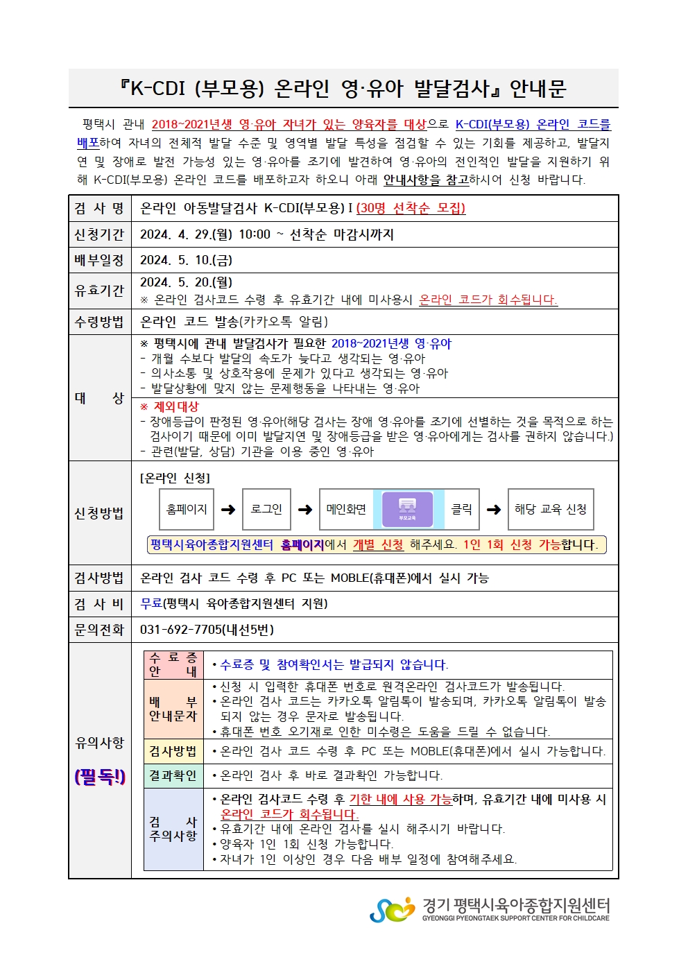 | 교육명 | [부모용]온라인 영유아 발달검사 K-CDI 검사 코드 발송(5.10(금)순차적으로 배부) | 교육형태 | 온라인 검사 |