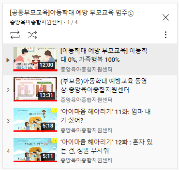 [접수방법] ① 센터 홈페이지 신청 ② 온라인 교육 이수(인증샷 필수) <온라인 교육 링크주소> '[공통부모교육] 아동학대예방 부모교육 범주① ( **** 아래 제목 클릭) '아동학대 0%, 가족행복 100%' https://youtu.be/GtpOMnTZngQ '(부모용)아동학대 예방교육 동영상' https://youtu.be/OEYuhGKUoeo '아이마음 헤아리기' 11화 : 엄마 내가 싫어? https://youtu.be/GMsdIR-jJFI '아이마음 헤아리기' 12화 : 혼자 있는건 정말 무서워 https://youtu.be/IFEvKZ5-g4I