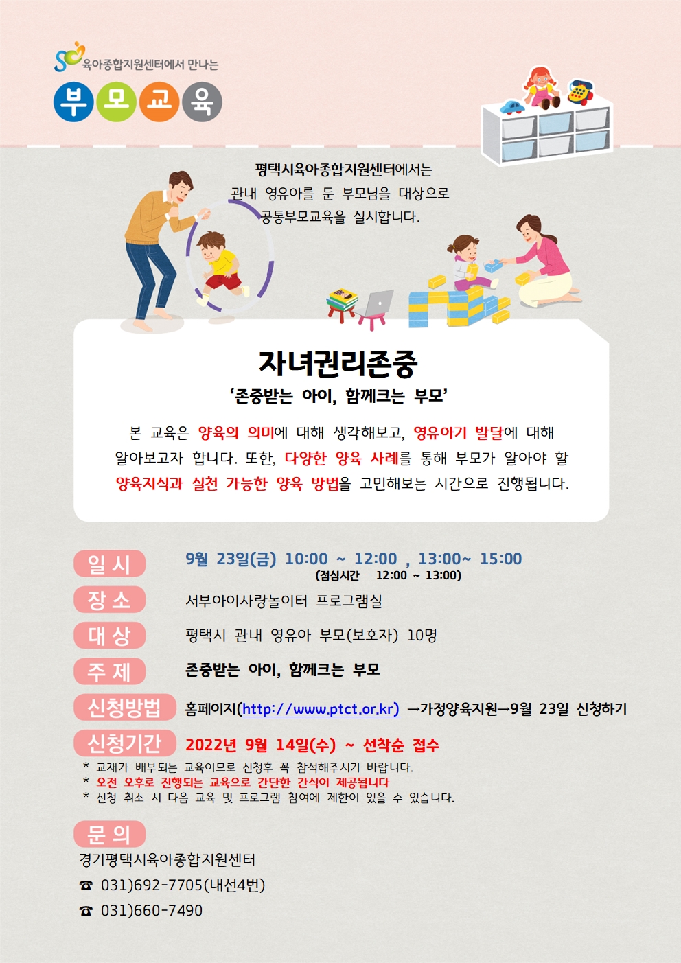 * * 반드시 읽어주세요 * * ※ 평택시 관내 영유아 가정양육을 지원하는 교육으로, 수료증 발급은 되지 않습니다. ※ 교재가 배부되는 교육이므로 신청 후 꼭 참석해주시기 바랍니다. ※ 오전 오후로 진행되는 교육으로 간단한 간식이 제공됩니다. ※ 신청 취소 시 다음 교육 및 프로그램 참여에 제한이 있을 수 있습니다.