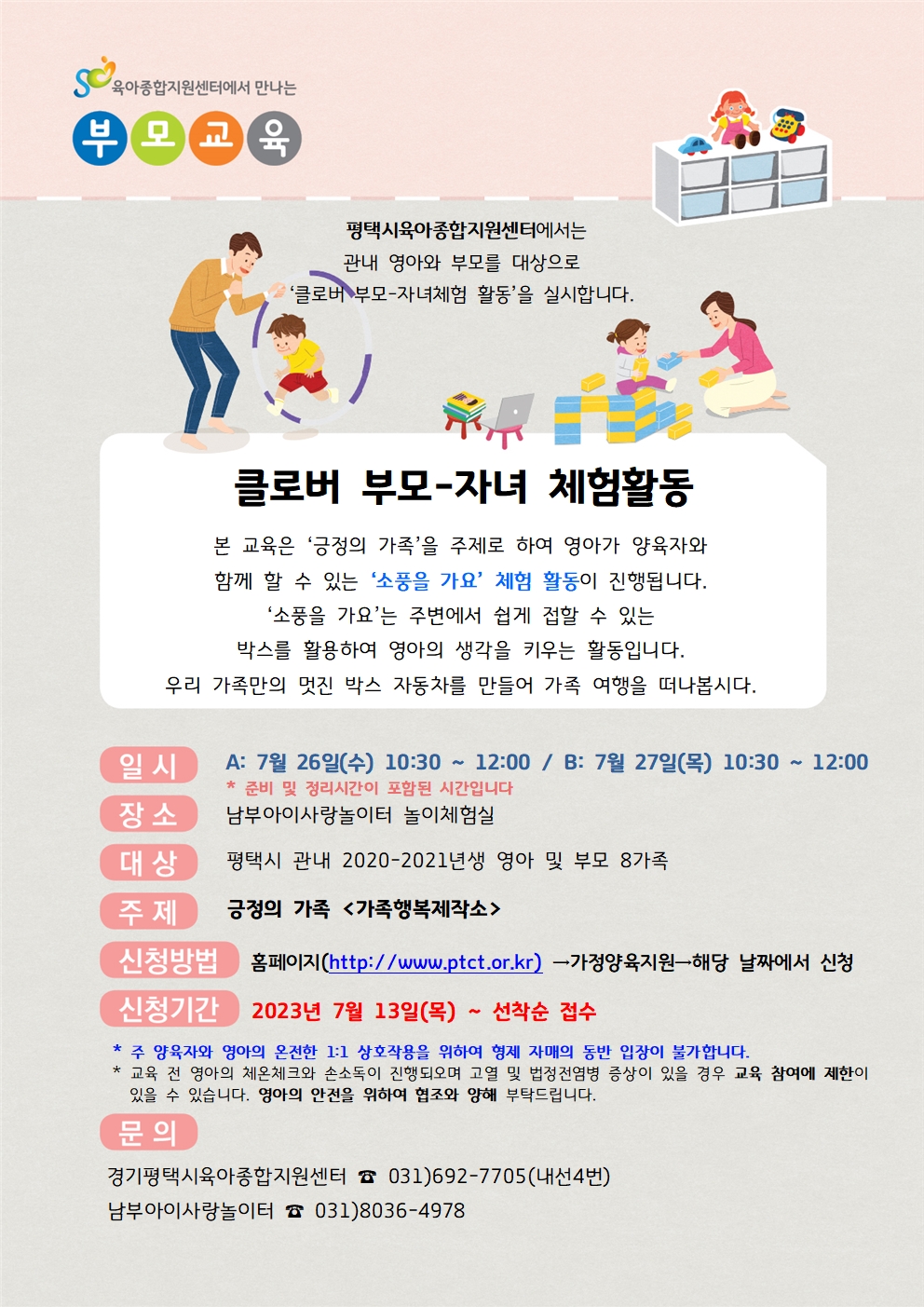 ☎문의: 평택시육아종합지원센터 부모교육 담당자(031-692-7705 내선4번)