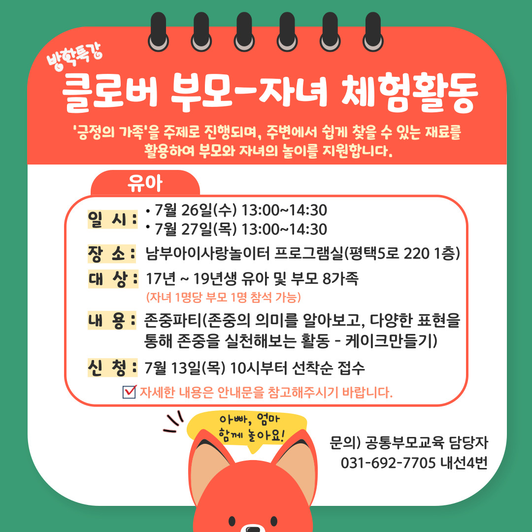 ** 반드시 읽어주세요 ** - 일시 : 7월 27일 오후 1시~2시 30분 - 강사 : 윤현경 강사(공통부모교육 강사진) - 장소 : 남부아이사랑놀이터 프로그램실 ※ 신청기간 : 7월 13일(목) 10시부터 선착순 접수 ※ 취소 시 대기자 접수를 위하여 최소 전 날 까지는 꼭 전화주시기 바랍니다. ※ 26일과 동일한 교육이므로 중복 신청이 불가합니다. ※ 복지관 내 이동시에는 마스크 착용을 권장하고 있습니다. 또한, 교육장소에서는 마스크는 자율적 선택으로 진행되기 때문에 교육 전 유아의 체온체크가 진행되오며 고열 및 법정전염성의 증상이 있을 경우 교육 참여에 제한이 있을 수 있습니다. 유아의 안전을 위해 협조와 양해 부탁드립니다. ※ 준비 및 정리 시간이 포함된 시간입니다. 예정 시간보다 더 일찍 끝날 수 있습니다.