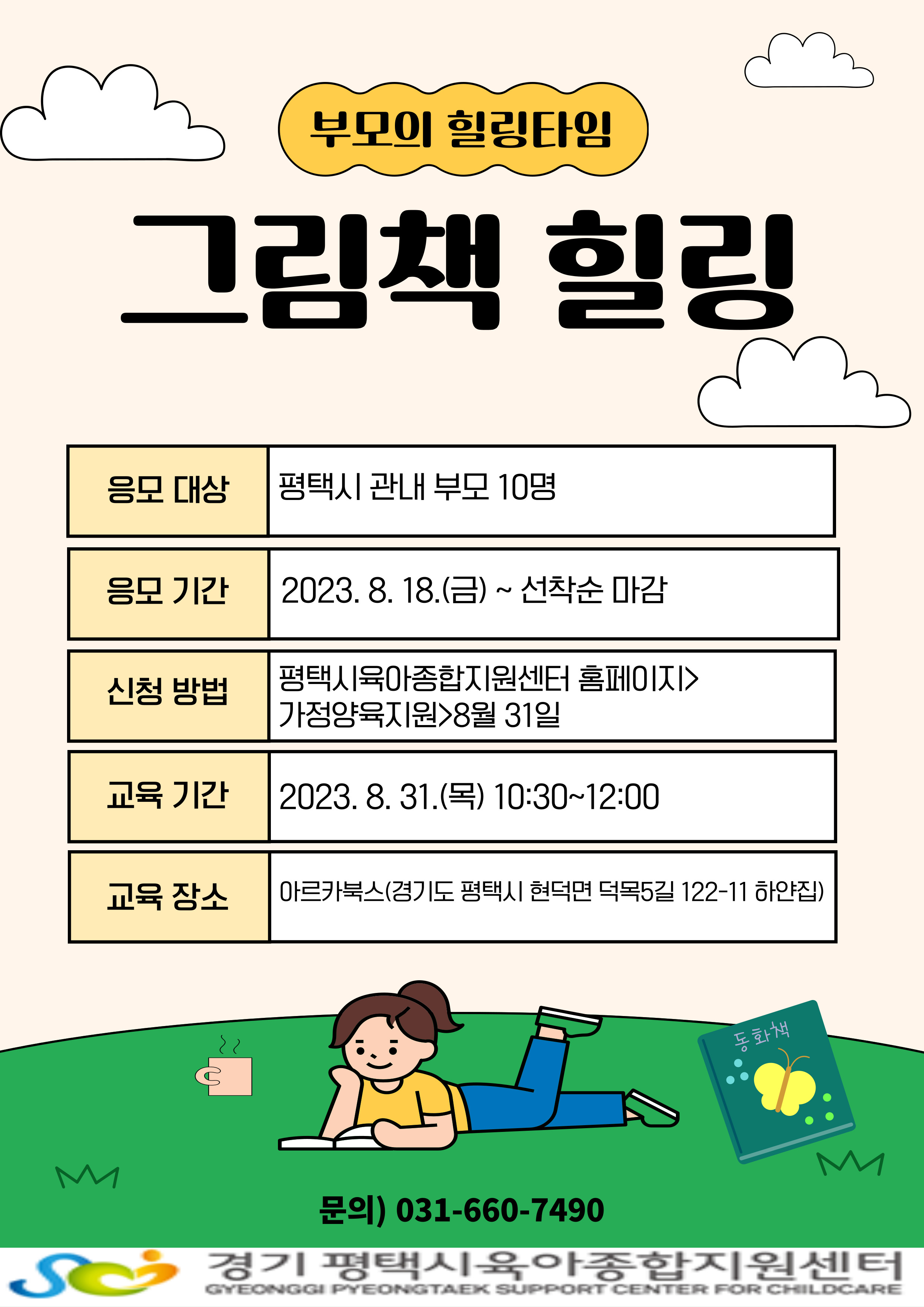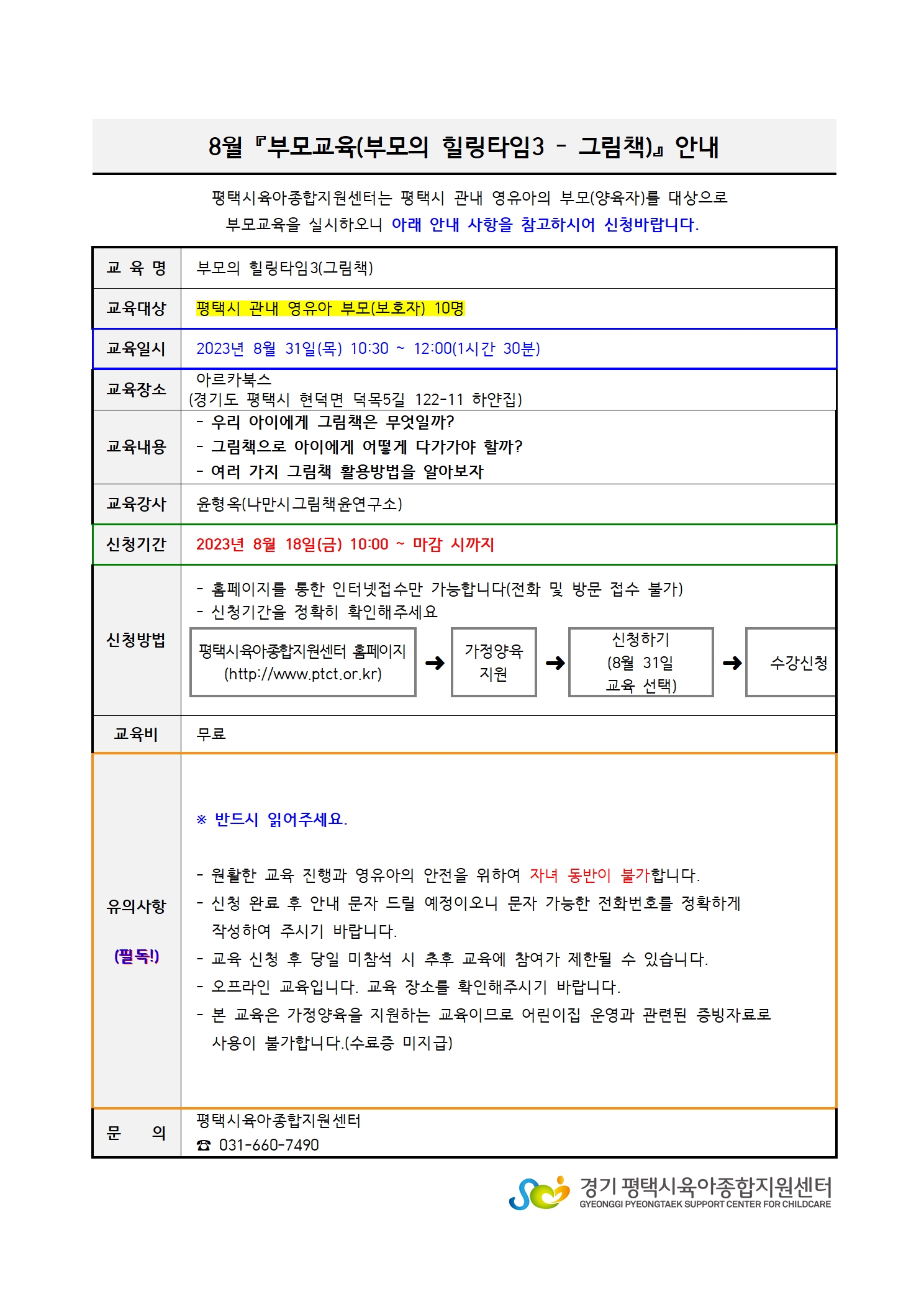* * 반드시 읽어주세요 * * ※ 평택시 관내 영유아 가정양육을 지원하는 교육으로, 수료증 발급은 되지 않습니다. ※ 신청 취소 시 다음 교육 및 프로그램 참여에 제한이 있을 수 있습니다. ※ 참석 가능하신분만 신청부탁드립니다. ※ 원활한 교육진행과 영유아의 안전을 위하여 자녀 동반이 불가합니다. ☎문의: 자체부모교육 담당자(031-660-7490)