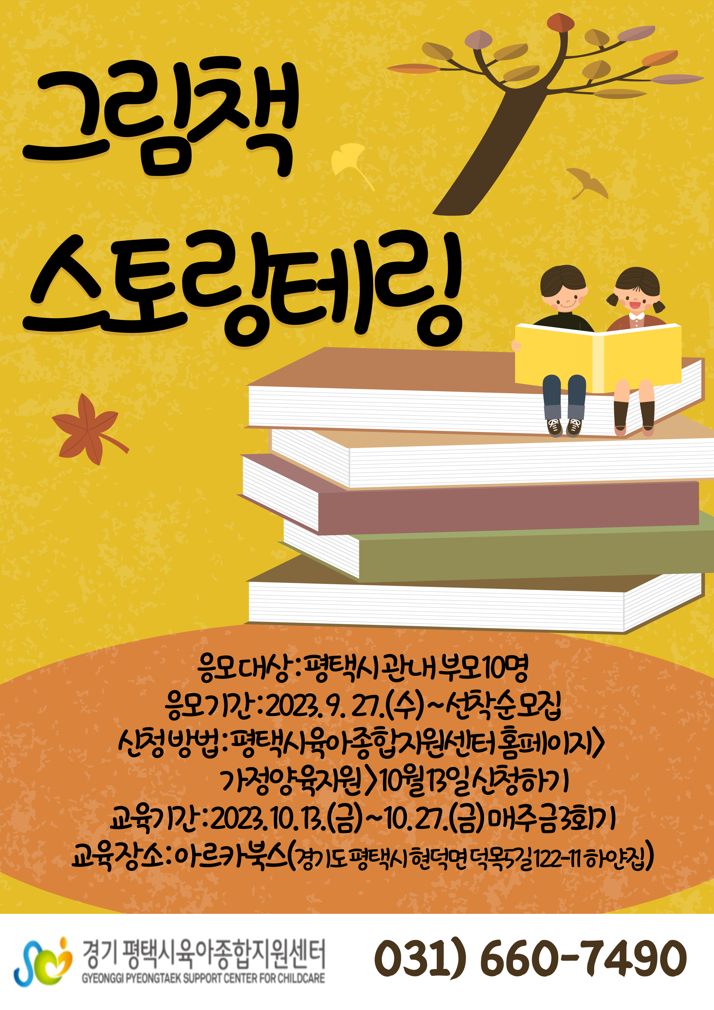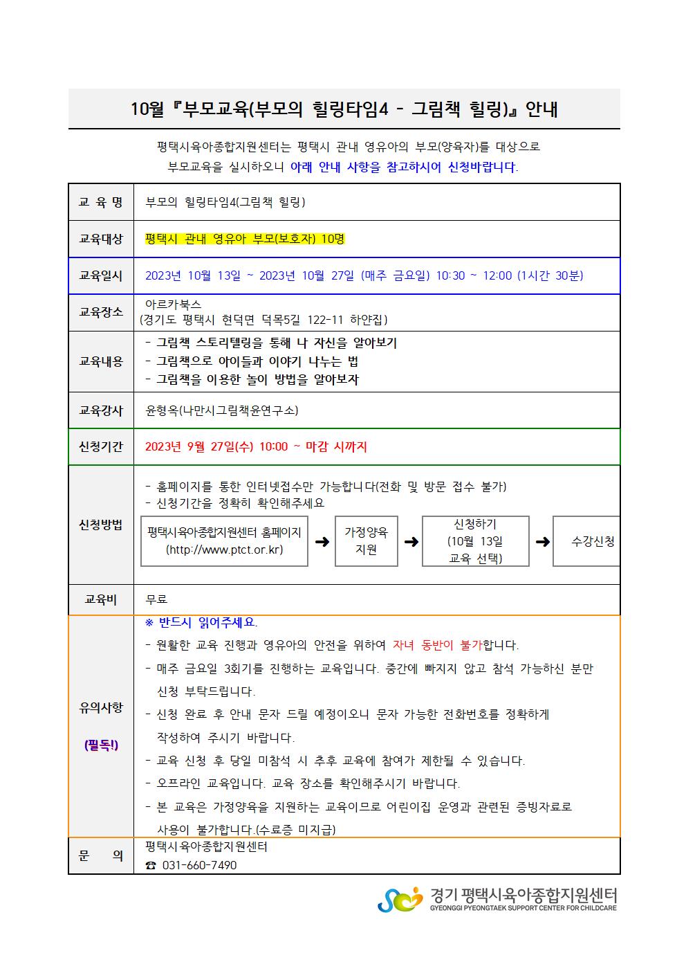 * * 반드시 읽어주세요 * * ※ 평택시 관내 영유아 가정양육을 지원하는 교육으로, 수료증 발급은 되지 않습니다. ※ 신청 취소 시 다음 교육 및 프로그램 참여에 제한이 있을 수 있습니다. ※ 3회기 참석 가능하신분만 신청부탁드립니다. ※ 자녀 동반이 불가능합니다. ☎문의: 자체부모교육 담당자(031-660-7490)