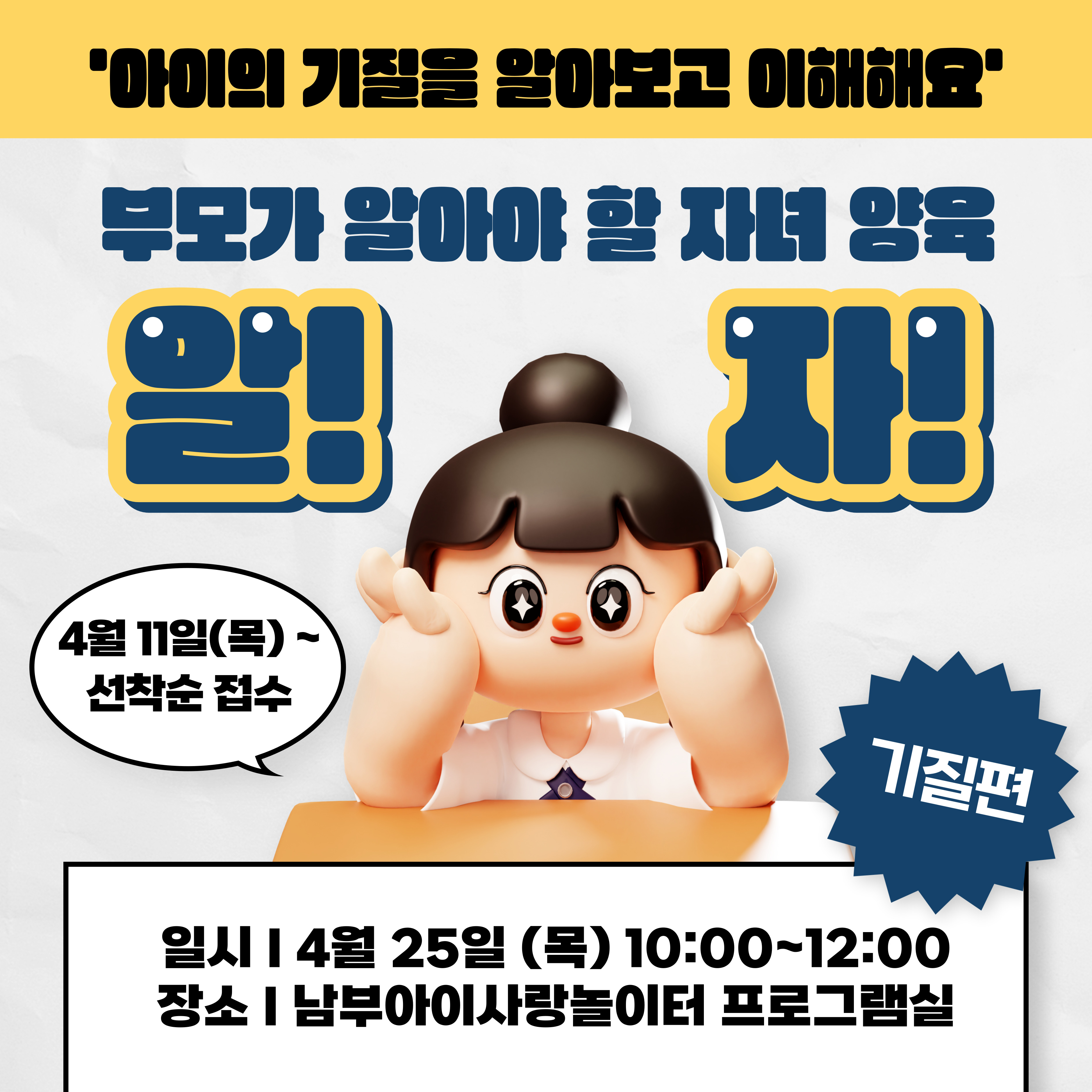 | 교육명 | 부모가 알아야 할 자녀 양육 '알! 자!' 기질편 | 교육형태 | 오프라인 소규모 |