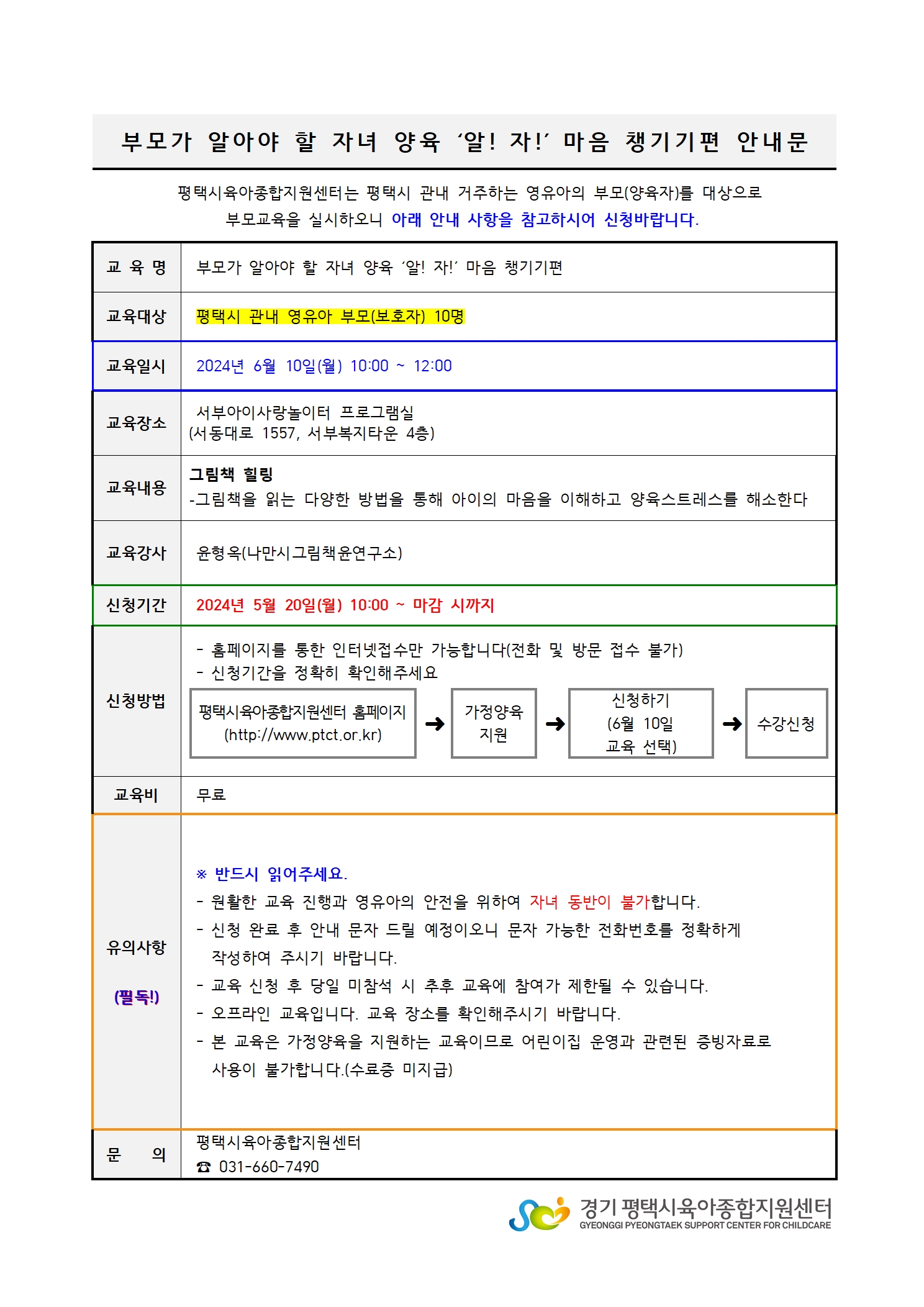 | 교육명 | 부모가 알아야 할 자녀 양육 '알! 자!' 마음챙기기편 | 교육형태 | 오프라인 소규모 |