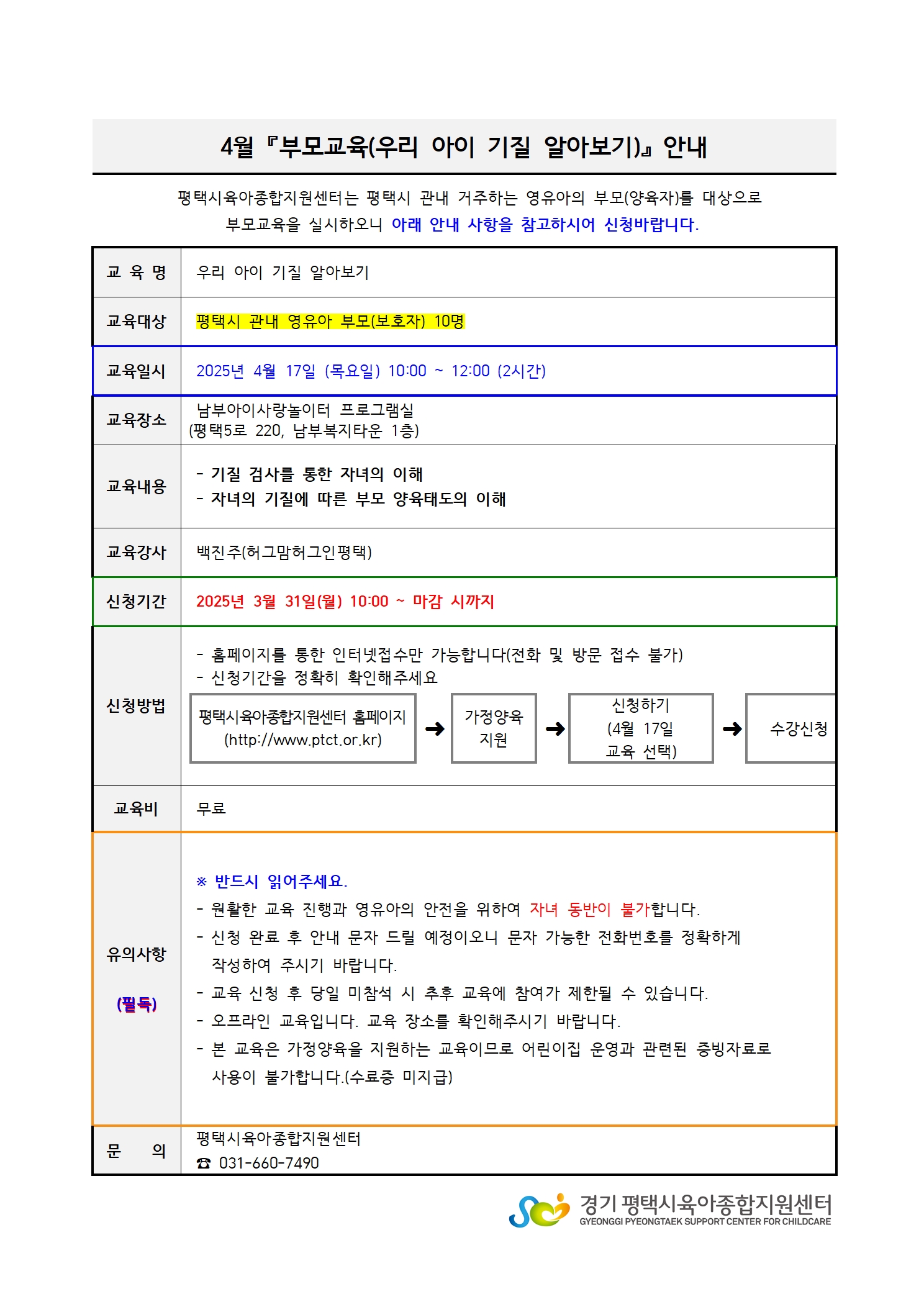 * * 반드시 읽어주세요 * * ※ 평택시 관내 영유아 가정양육을 지원하는 교육으로, 수료증 발급은 되지 않습니다. ※ 신청 취소 시 다음 교육 및 프로그램 참여에 제한이 있을 수 있습니다. ※ 참석 가능하신분만 신청부탁드립니다. ※ 원활한 교육진행과 영유아의 안전을 위하여 자녀 동반이 불가합니다. ☎문의: 부모교육 담당자(031-660-7490) ![]() |