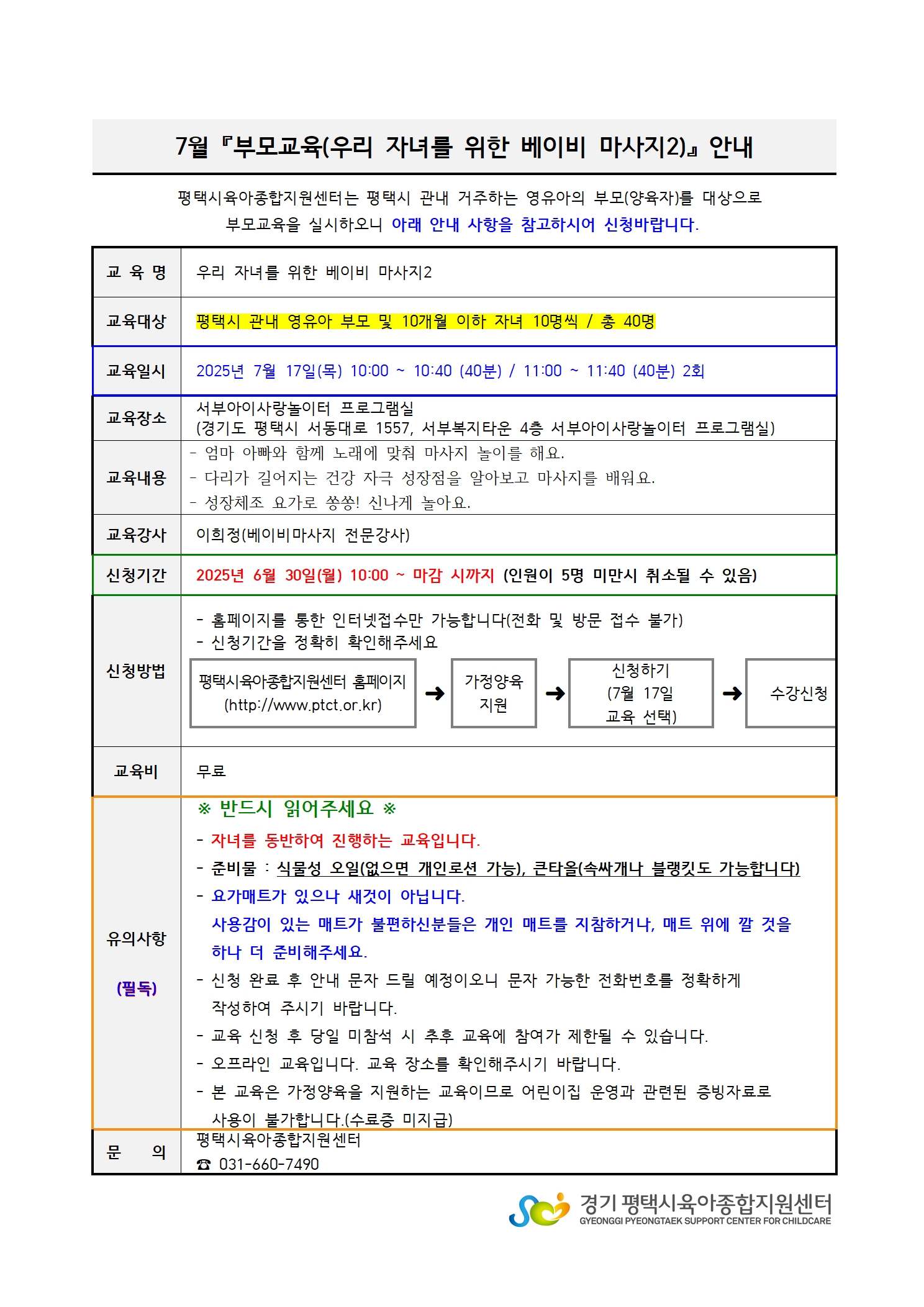 | 문의전화 | 031-660-7490 | 강 사 명 | 이희정(베이비마사지 전문강사) |