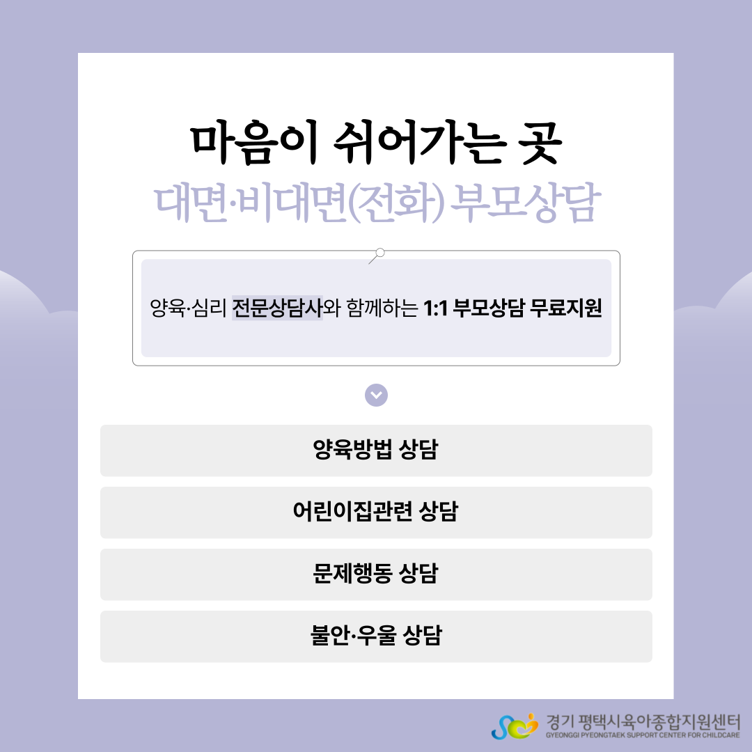 4. 양육상담 또는 심리상담(택 1)으로 진행되며, 상담비는 무료입니다.