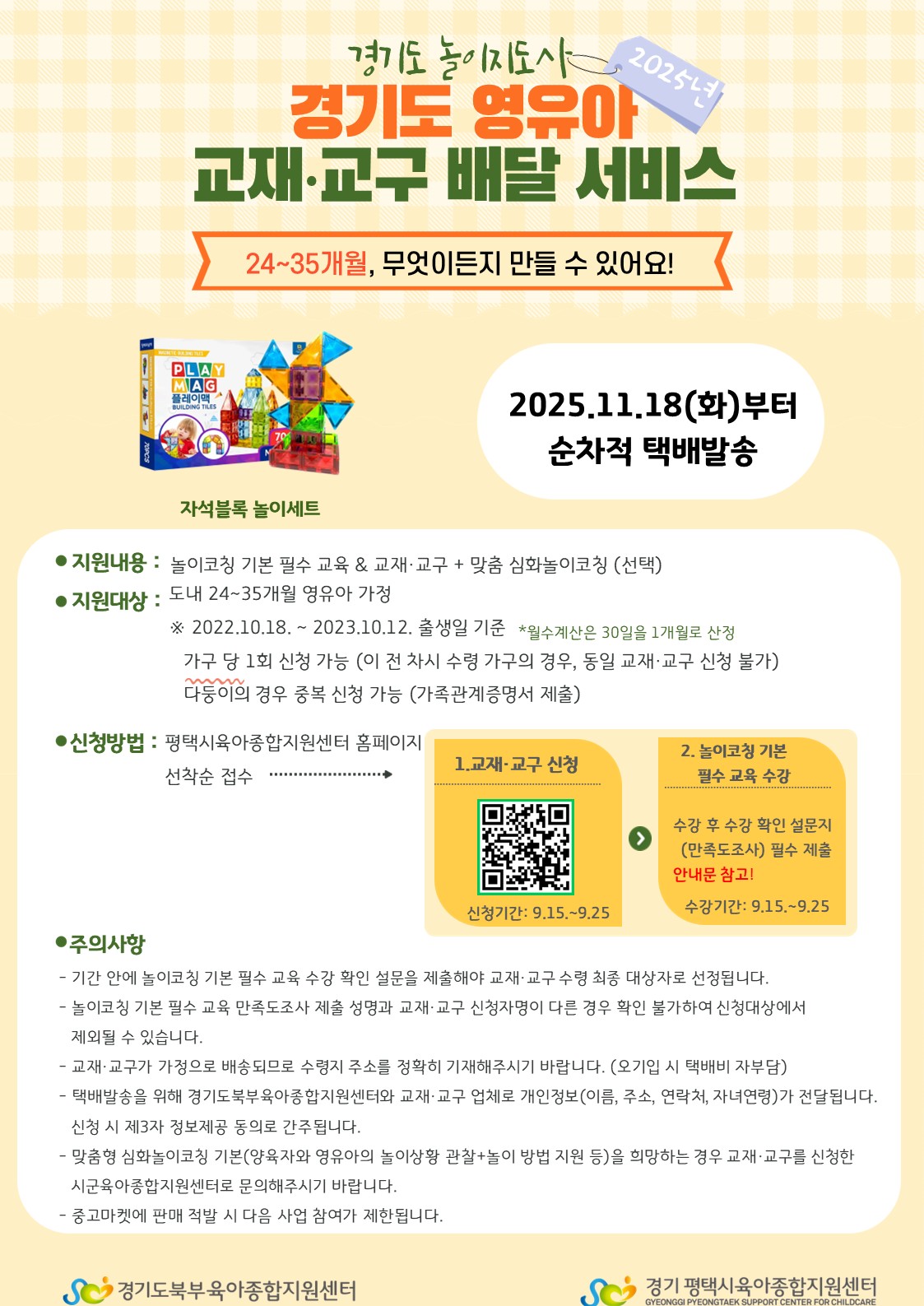 경기도북부육아종합지원센터에서 직접 가정으로 교재 교구가 발송이 되므로 주소 잘못 입력 시 추가 배송이 어렵습니다.