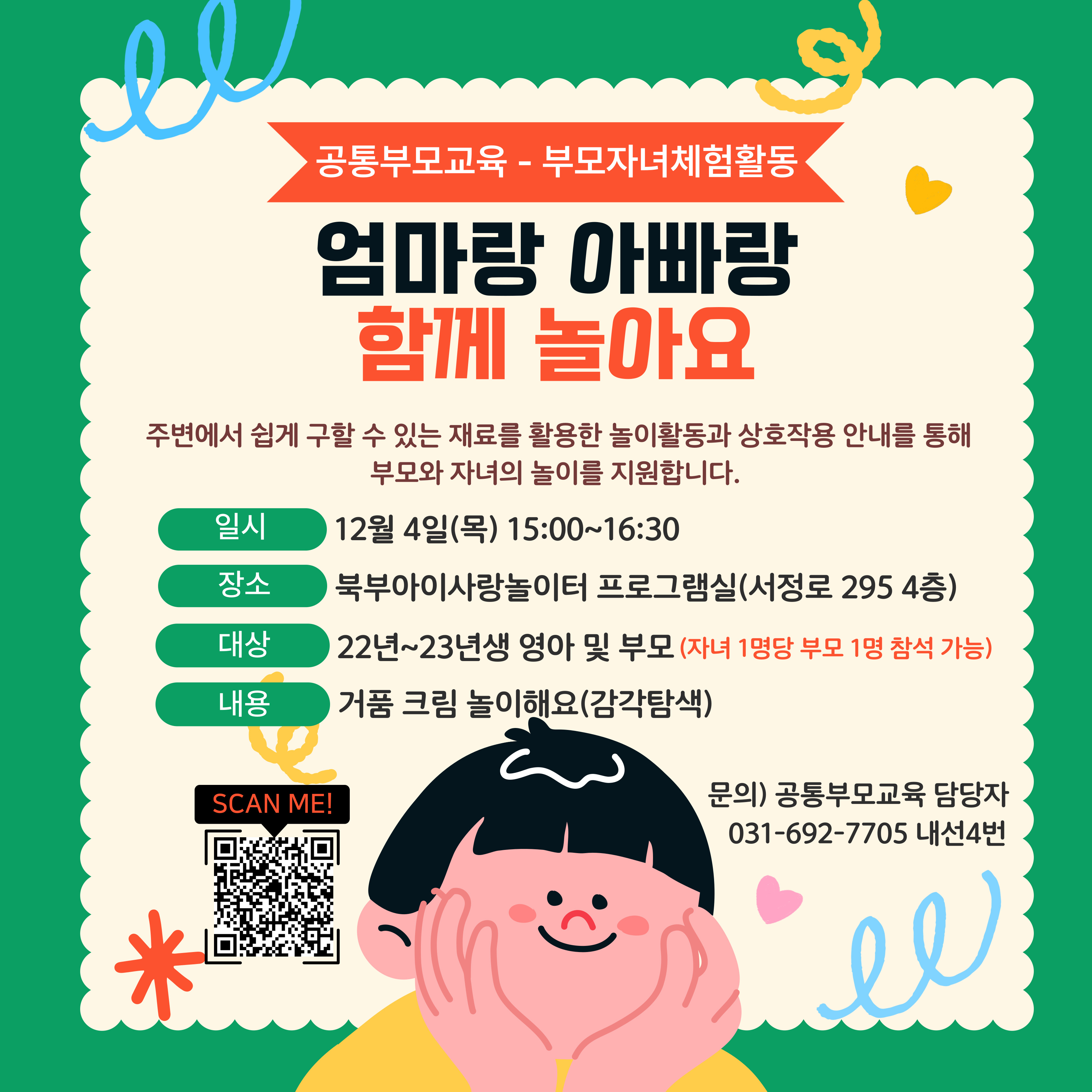 | 교육대상 | 부모 | 교육장소 | 북부아이사랑놀이터 프로그램실 |