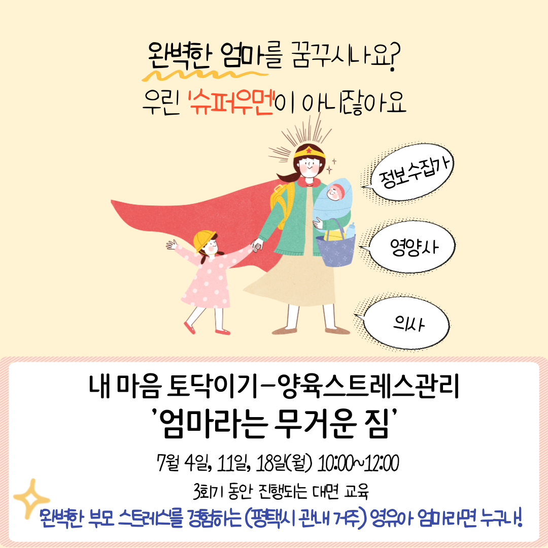 * * 반드시 읽어주세요 * * ※ 강의 및 활동(워크북 등)이 포함된 집단 상담 프로그램입니다. ※ 3회기 모두 참석가능하신 어머니만 신청해주시기 바랍니다. ※ 교육 특성상 자녀동반이 불가합니다. ※ 신청 취소 시 다음 교육 및 프로그램 참여에 제한이 있을 수 있습니다. ※ 평택시 관내 영유아 가정양육을 지원하는 교육으로, 수료증 발급은 되지 않습니다.