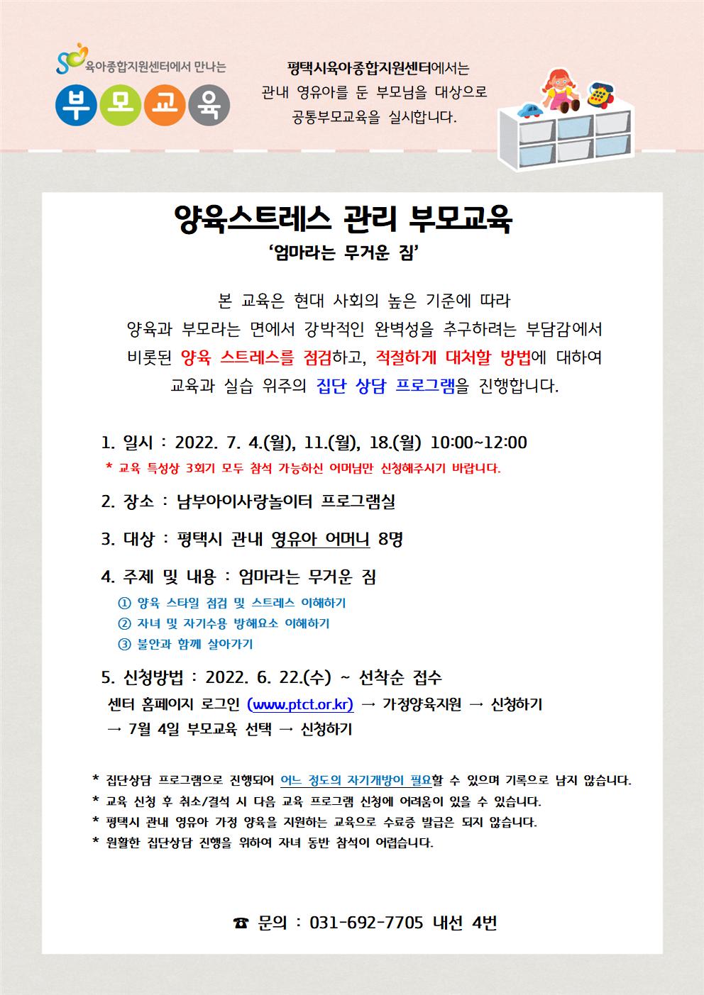 ☎문의: 평택시육아종합지원센터 부모교육 담당자(031-692-7705 내선4번)